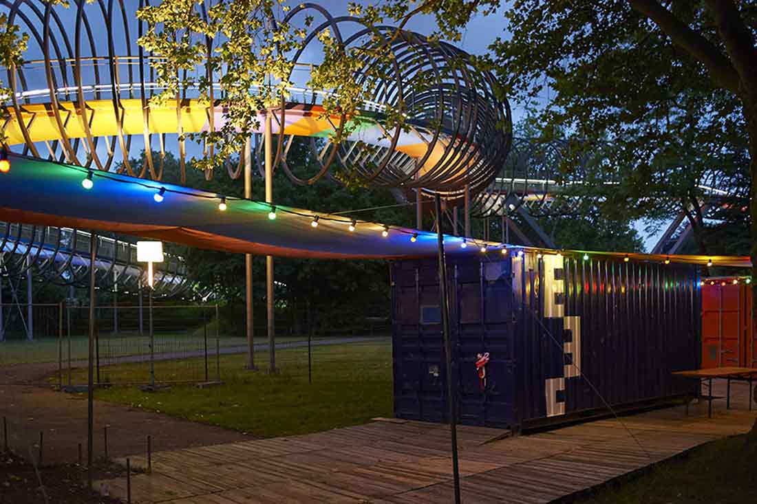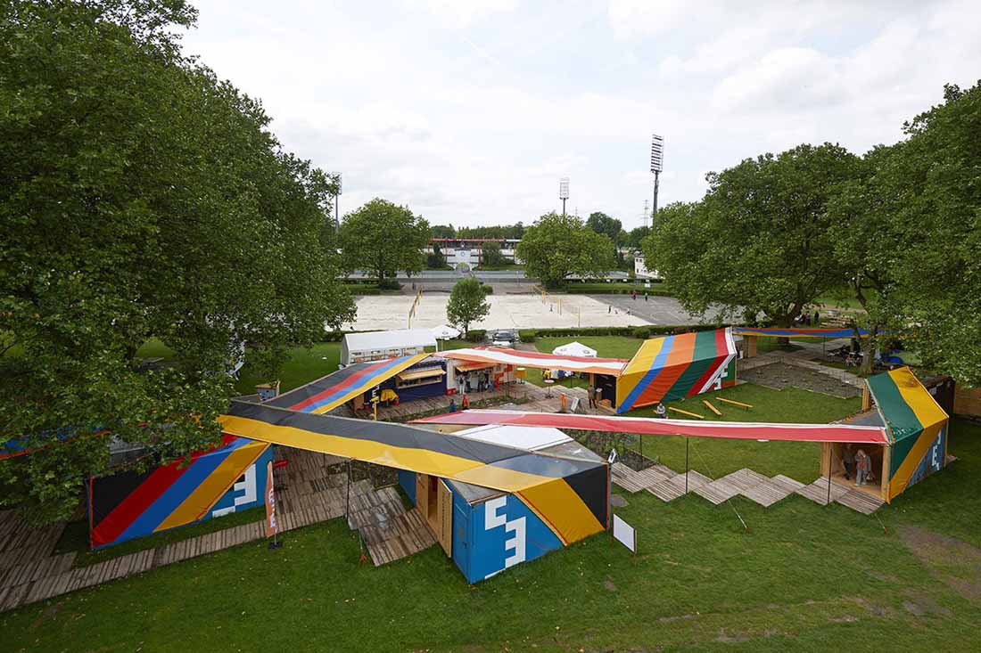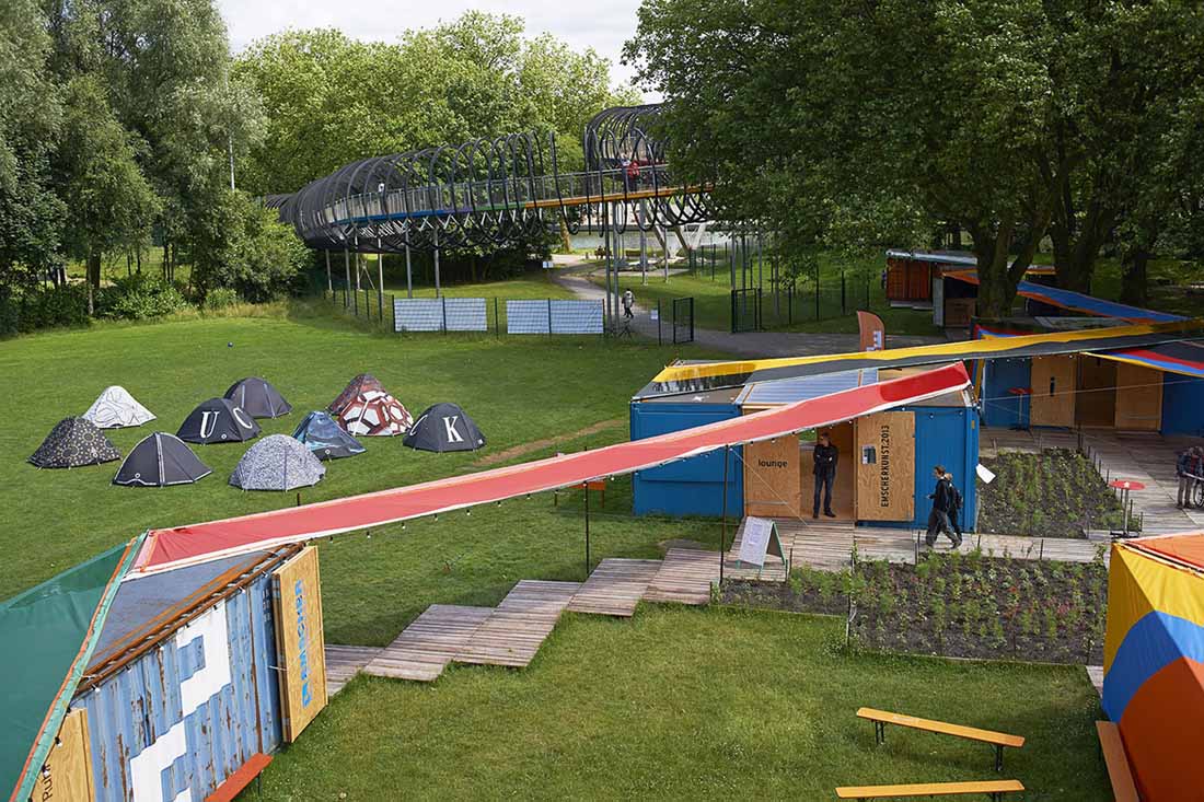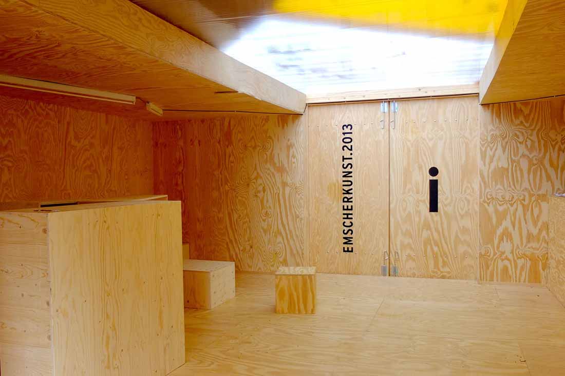 Emscherkunst.2013的临时访客中心和当地艺术协会的艺术营是由可重复使用的集装箱与帐篷制成的。通过严格地将布局保持在地面上并参照穿过村庄的路径,不仅要注意内部空间,而且要注意在空间之间由屋顶或露天遮蔽的空间。