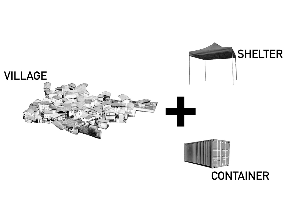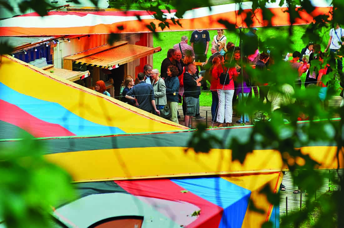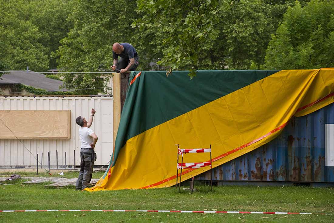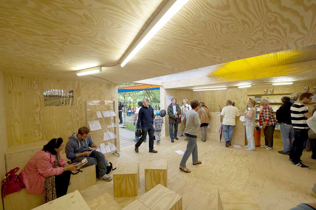 Emscherkunst.2013的临时访客中心和当地艺术协会的艺术营是由可重复使用的集装箱与帐篷制成的。通过严格地将布局保持在地面上并参照穿过村庄的路径,不仅要注意内部空间,而且要注意在空间之间由屋顶或露天遮蔽的空间。