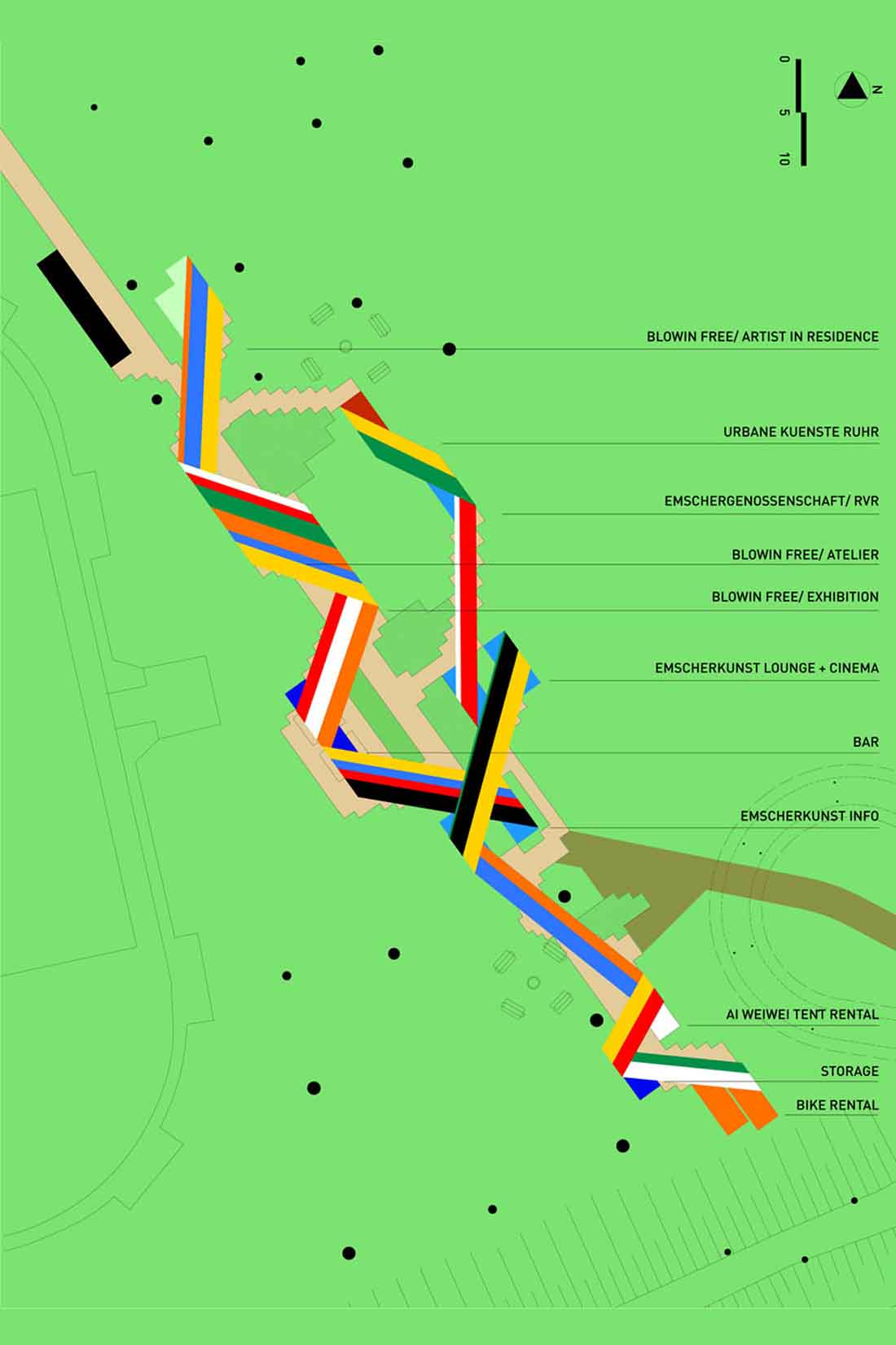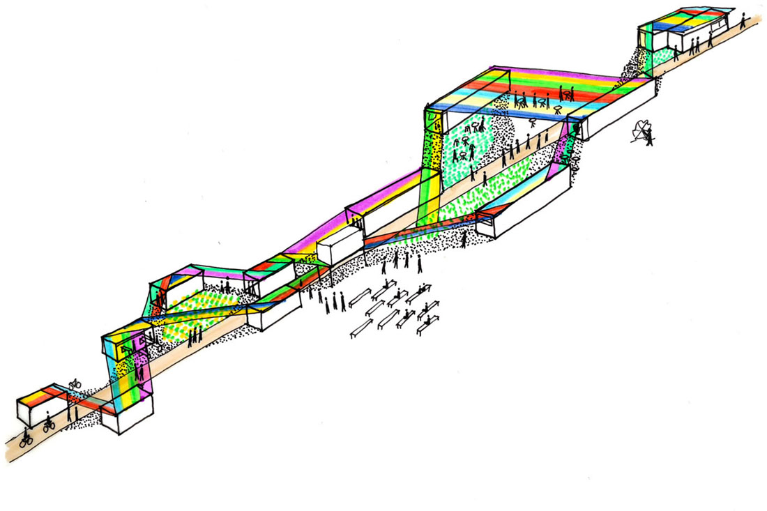 设计师通过这种方式,可以创建各种社交空间,同时保持网站的完全渗透性。从游客中心到艺术营地,再将莱茵黑尔讷运河连接到Lindnerstrasse,沿着这条道路,将进行各种活动。