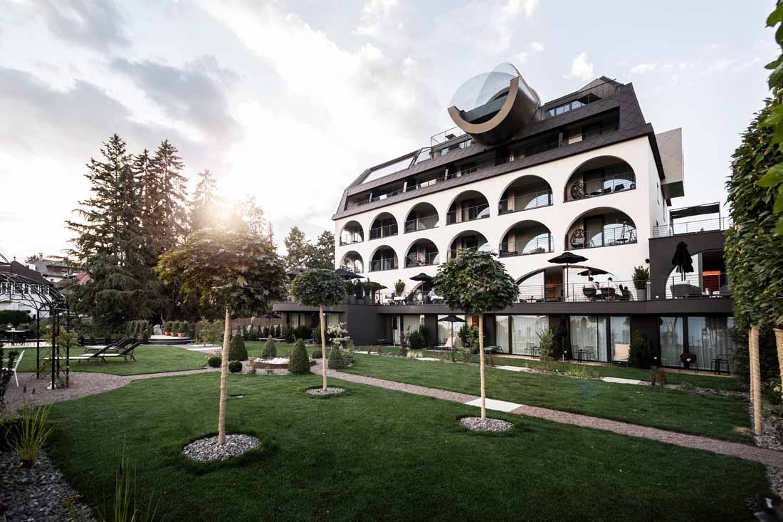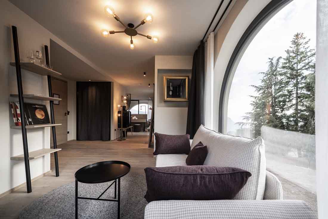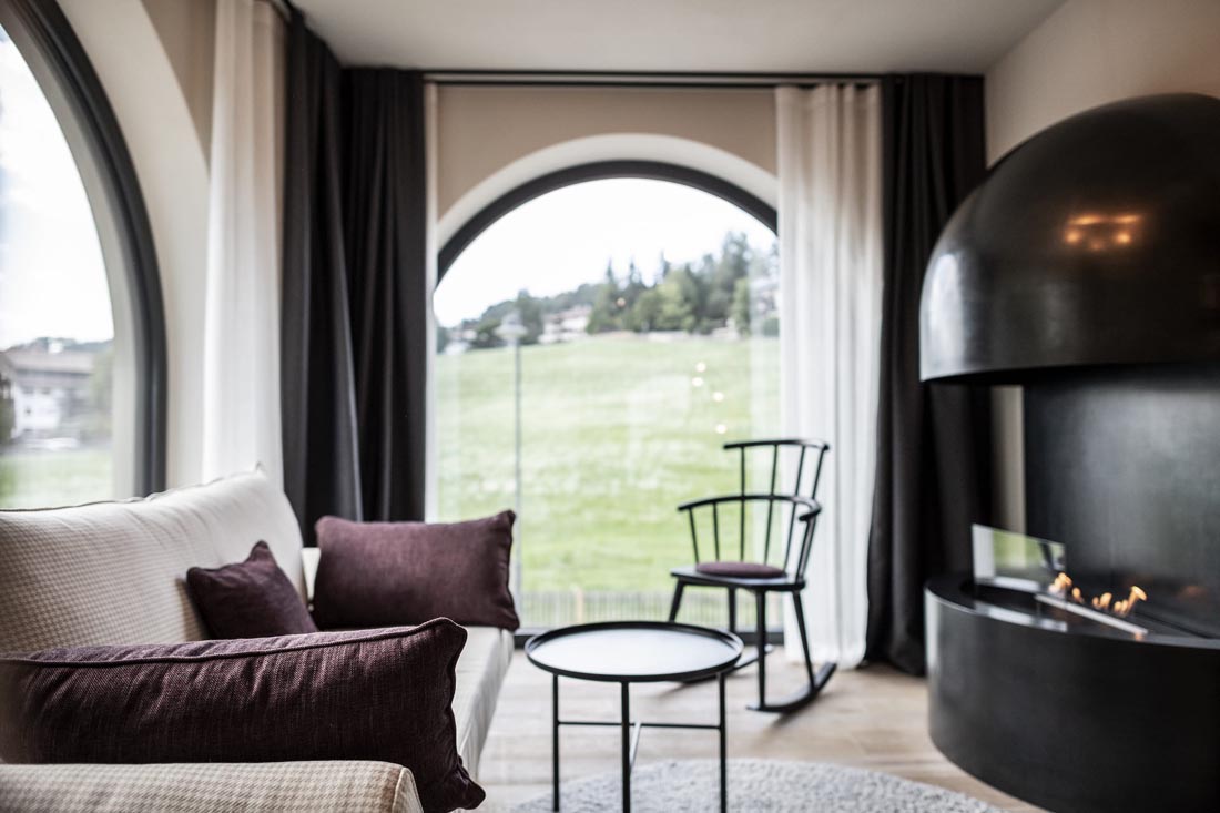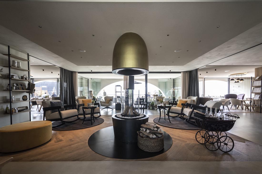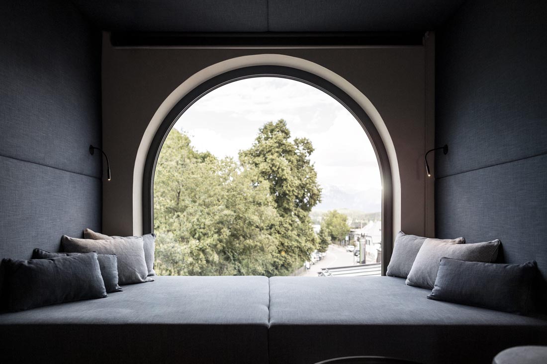 Ritten新艺术建筑的永恒性以一种抽象的方式体现在建筑室内。比如,一种明显的、统一中又有变化的元素形成一个重复的细节,遍布整个建筑。拱形的主题元素也可以在室内找到延续,例如房间里,底部圆形的镜子,休息室的壁炉,拱形元素都能在其自身的主题轴线上突显,甚至是spa露台上休息室的靠背。家具大多是独立式的,随意放置,优雅和质朴的室内装潢增强了其氛围。所有的事物中,都是独一无二的、从跳蚤市场或从以前的酒店发现的小珍宝。悬挂在天花板上的金灯雕塑也遍布了整栋建筑。