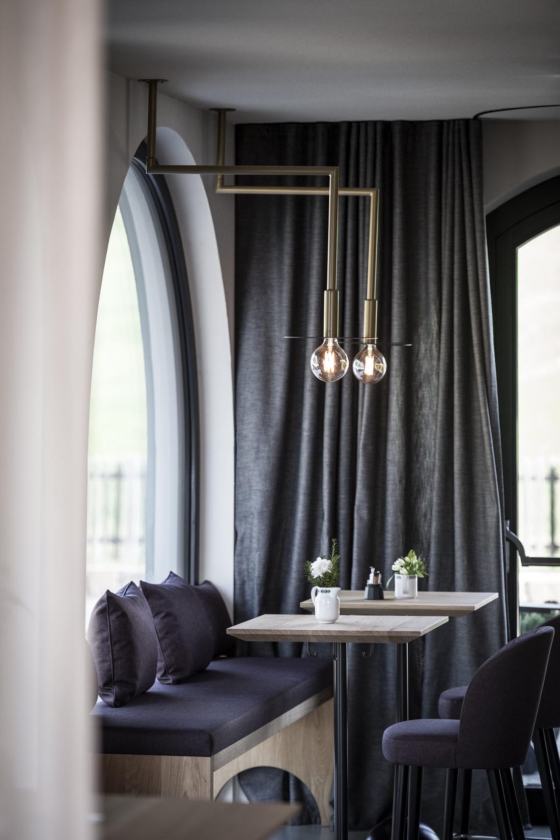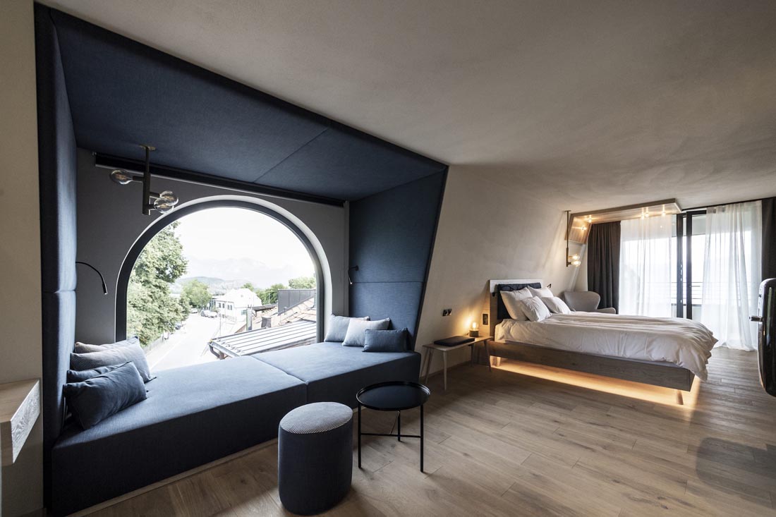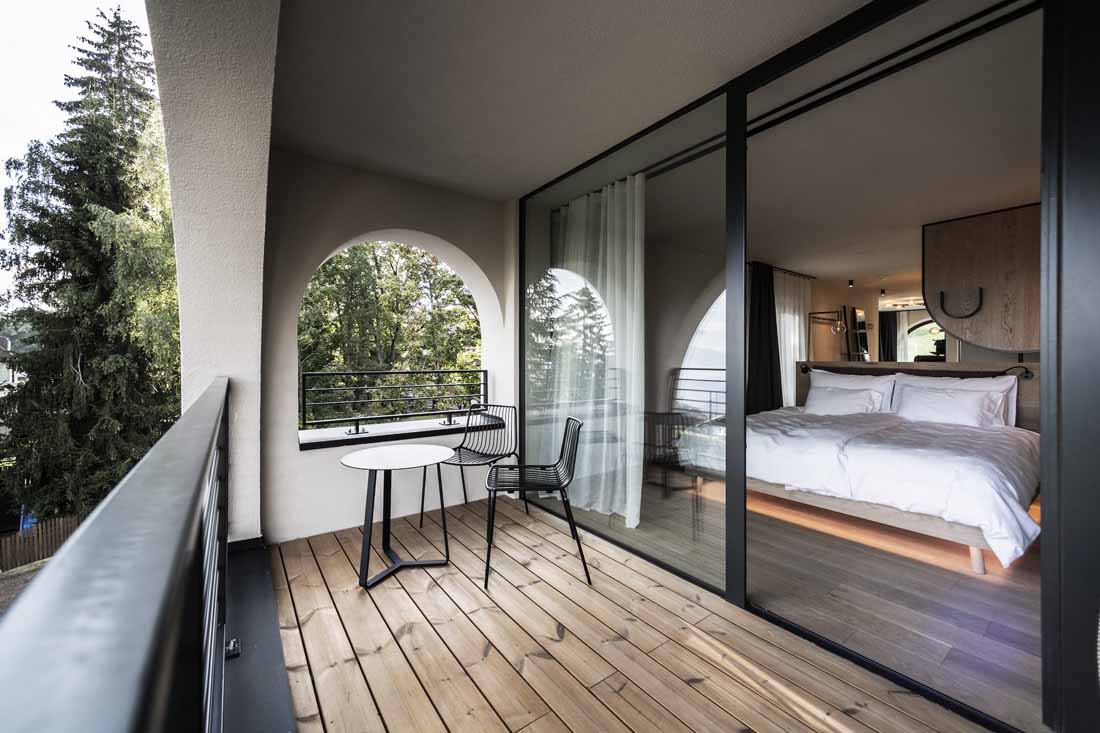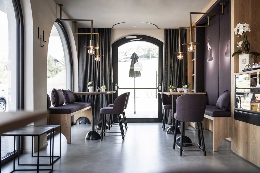 Ritten新艺术建筑的永恒性以一种抽象的方式体现在建筑室内。比如,一种明显的、统一中又有变化的元素形成一个重复的细节,遍布整个建筑。拱形的主题元素也可以在室内找到延续,例如房间里,底部圆形的镜子,休息室的壁炉,拱形元素都能在其自身的主题轴线上突显,甚至是spa露台上休息室的靠背。家具大多是独立式的,随意放置,优雅和质朴的室内装潢增强了其氛围。所有的事物中,都是独一无二的、从跳蚤市场或从以前的酒店发现的小珍宝。悬挂在天花板上的金灯雕塑也遍布了整栋建筑。