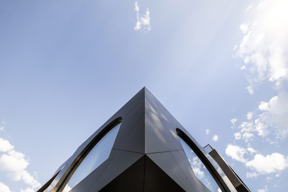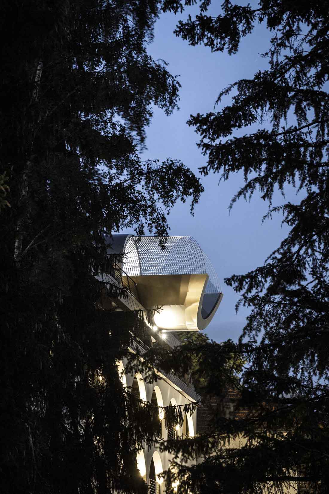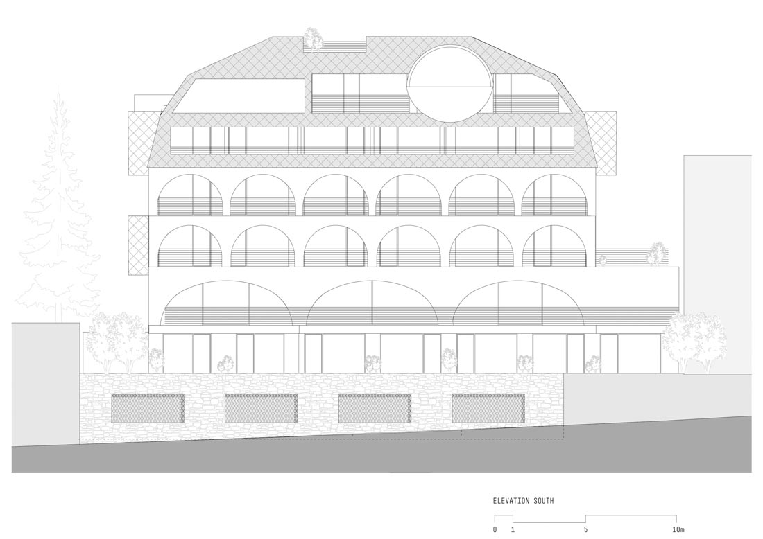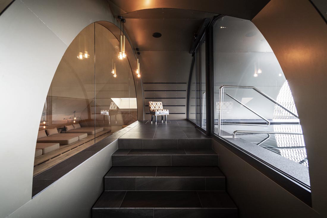 当然,最大的亮点是有着豪华悬臂游泳池的水疗区,人们从远处就能看到。水疗区设有宽阔的休息区,静养区,以及一些位于凸窗顶部或切入屋顶的私密的露台,人们可以在新鲜的空气中放松休憩。另一个独特的引人注目的地方,是在建筑的南侧切入倾斜屋顶的巨大圆柱体,它在正面的另一侧突出了一个倒置的拱门,形成一个特殊的游泳池。