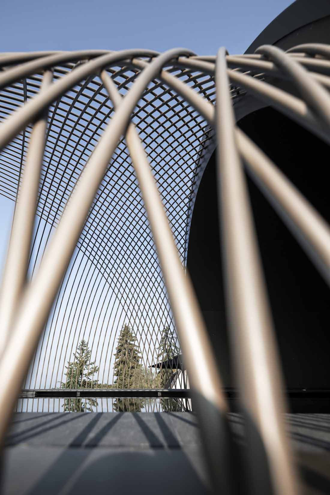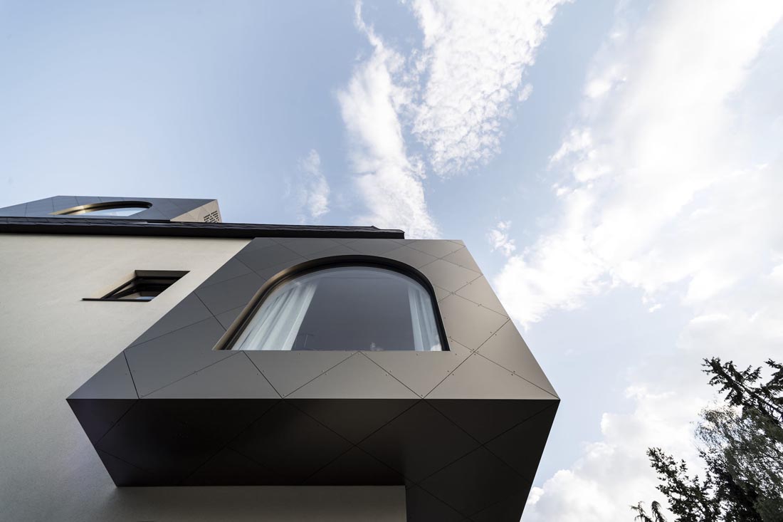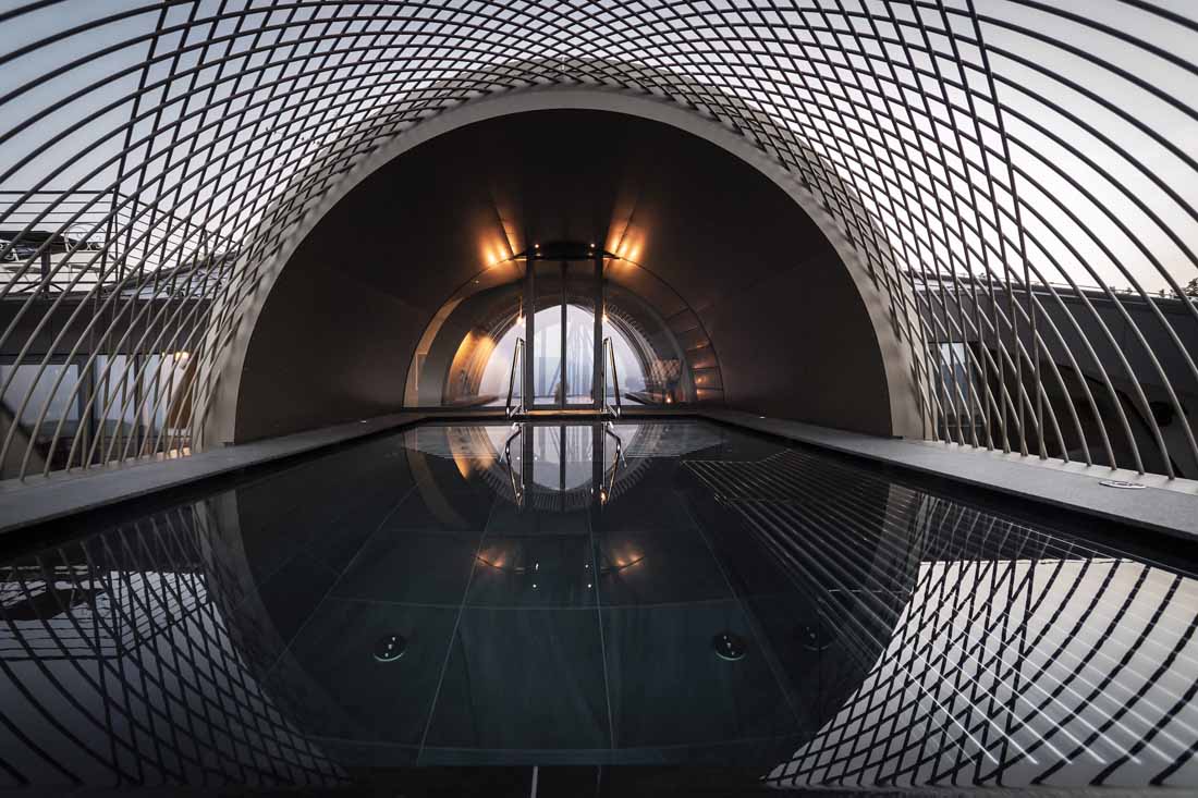 游泳池封闭的外壳上覆盖着和立体海湾窗户一样的古铜色铝板。它在深棕色的斜屋顶上形成了一种休闲的氛围,同时也产生了一种奇妙的倒影效果。在内部,有几个楼梯通向圆柱体的中心。自动推拉门打开,下潜入水中,伴随着弧形的外立面,一个人被引入天边的无边际泳池。