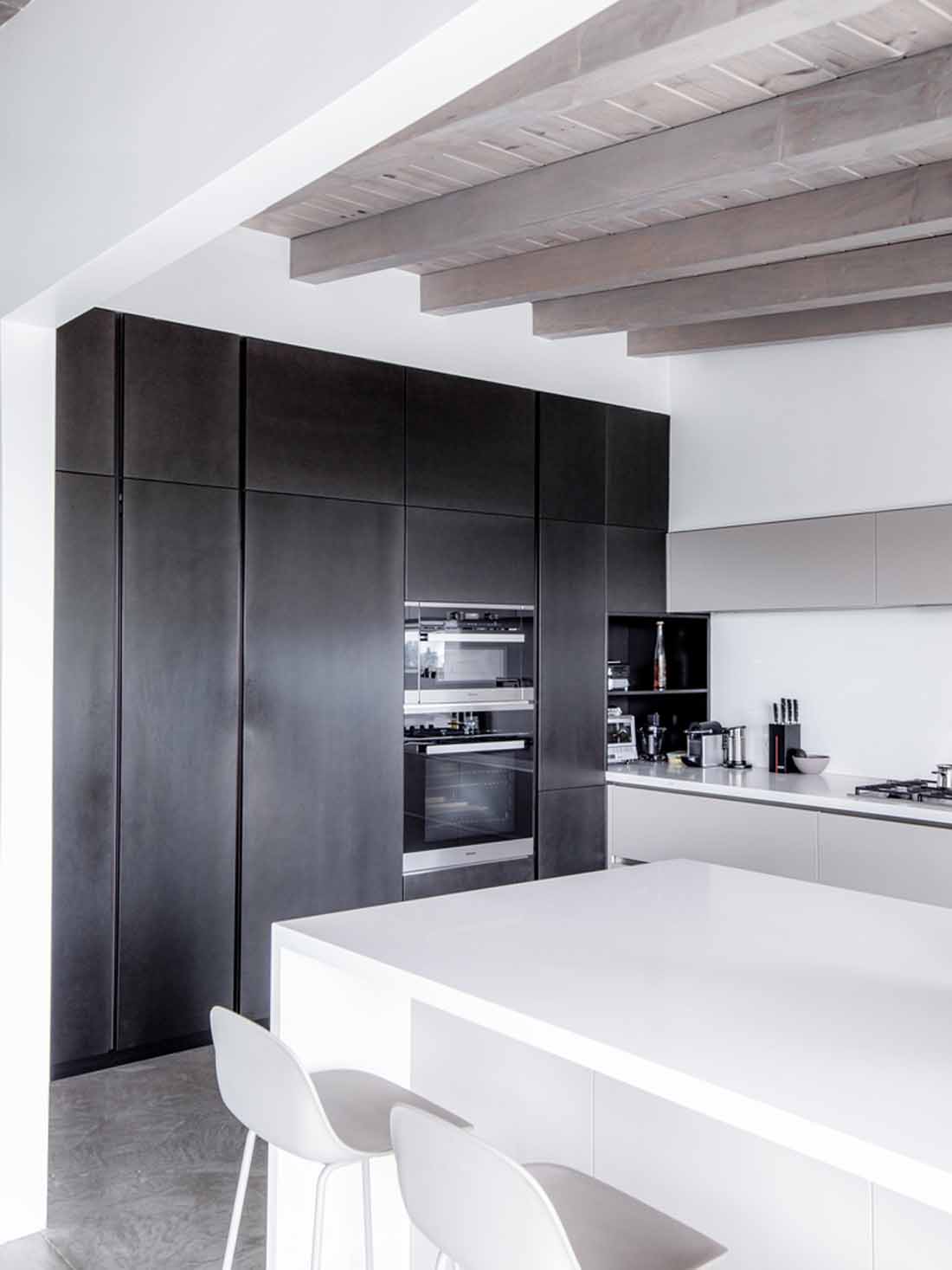 现有房屋改建的范围包括新主浴室的设计,完整的厨房改建,房屋内部的新饰面,新的外墙和阳台粉刷处理以及新的开窗。对于内部,选择了中性的黑色,灰色和白色色调。壁炉的墙壁和楼梯上覆盖着冷轧钢。关于外部结构工作,是为了扩大居住、用餐区域的现有空间,以便更好地观看海洋。