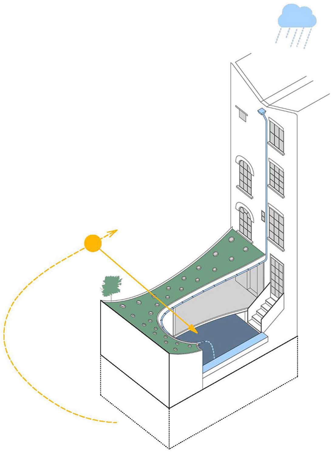 在地下室,防水混凝土结构的使用代替了二次防水系统和机械污水泵。隔热箱具有很高的热性能,一年中的大部分时间都不需要空间加热。通过扩展采光井,采光效果得到了显著改善,有效的被动通风策略也开始被采用。有助于可持续排水的绿色屋顶上种有景天和标本树,以适应当地的环境、改善生物的多样性。收集的雨水被用来填满倒影池和灌溉绿色屋顶,复杂的照明系统由低能耗的LED配件组成。