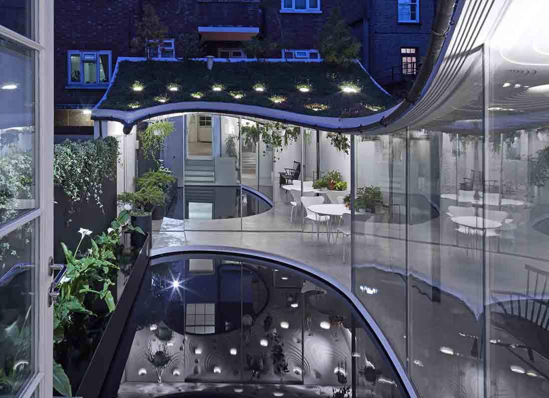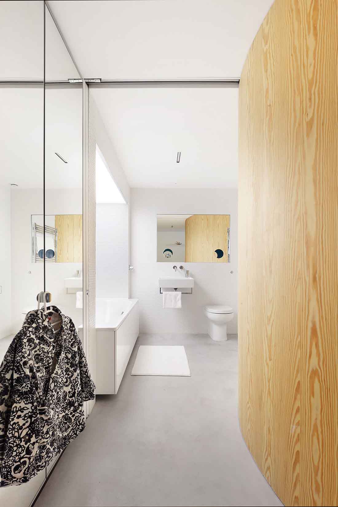 这些实用的功能,以及一个种植着通过绿色屋顶生长的树苗种植区,都被一扇滑动的镜面墙所隐藏。透过天井可以看到带有盖的封闭空间,空间底下的地下室被扩展成一间新卧室、两个浴室和一个杂物间。