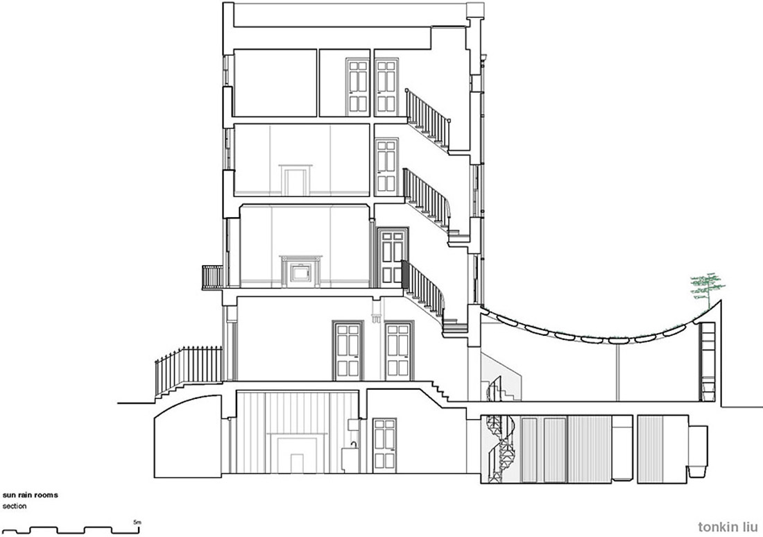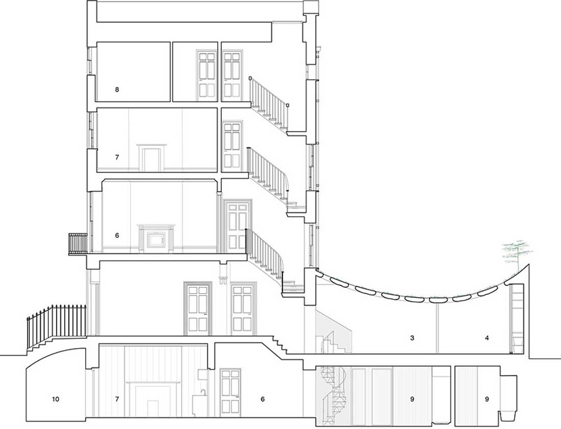 扩建部分包含了交叠在一起的家庭和工作功能,服务于平淡无奇又富有诗意的日常生活。在底层,新的花园屋被弯曲的玻璃墙所包围,成为家庭的起居空间和工作室的会议室。房间一直延伸到一个带顶棚的户外区域,该区域容纳了一个工作室、烹饪区、盆栽棚、雨水收集和储存池。