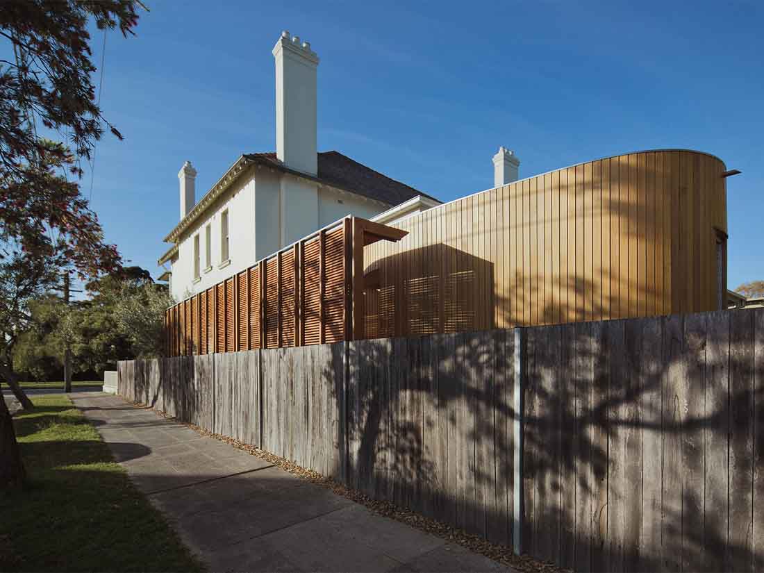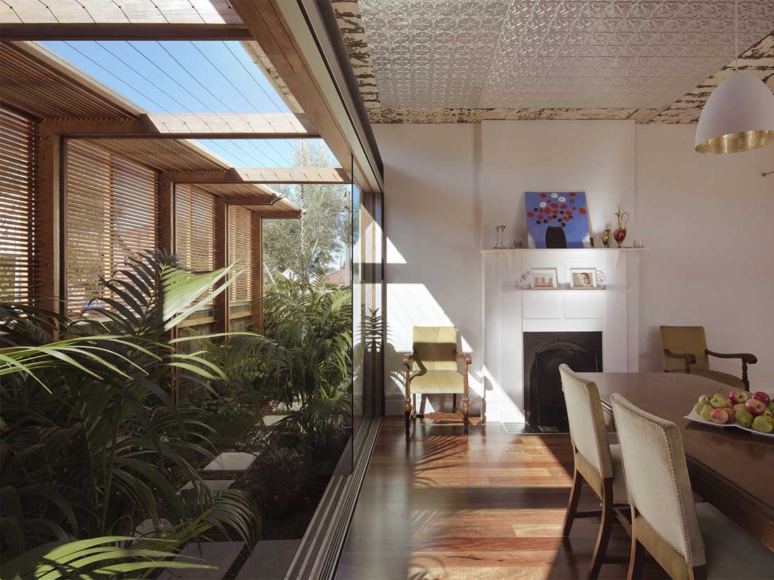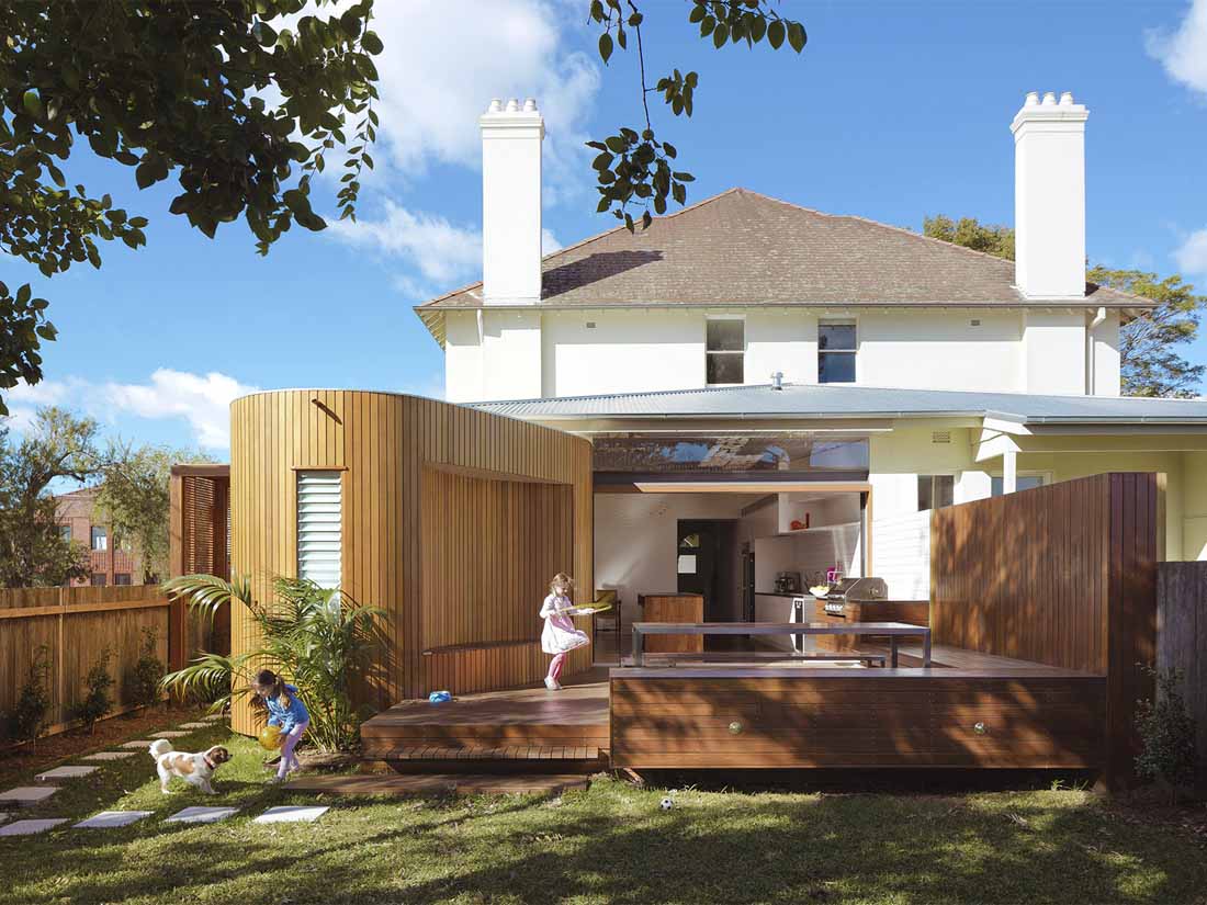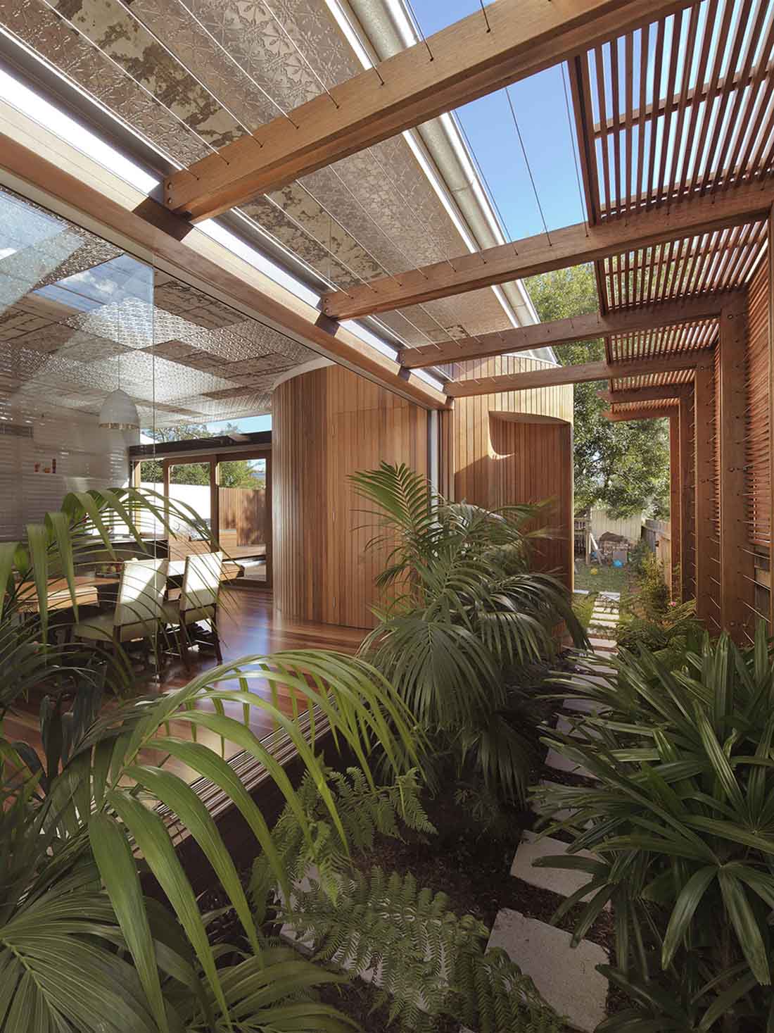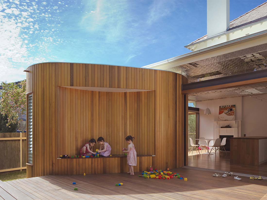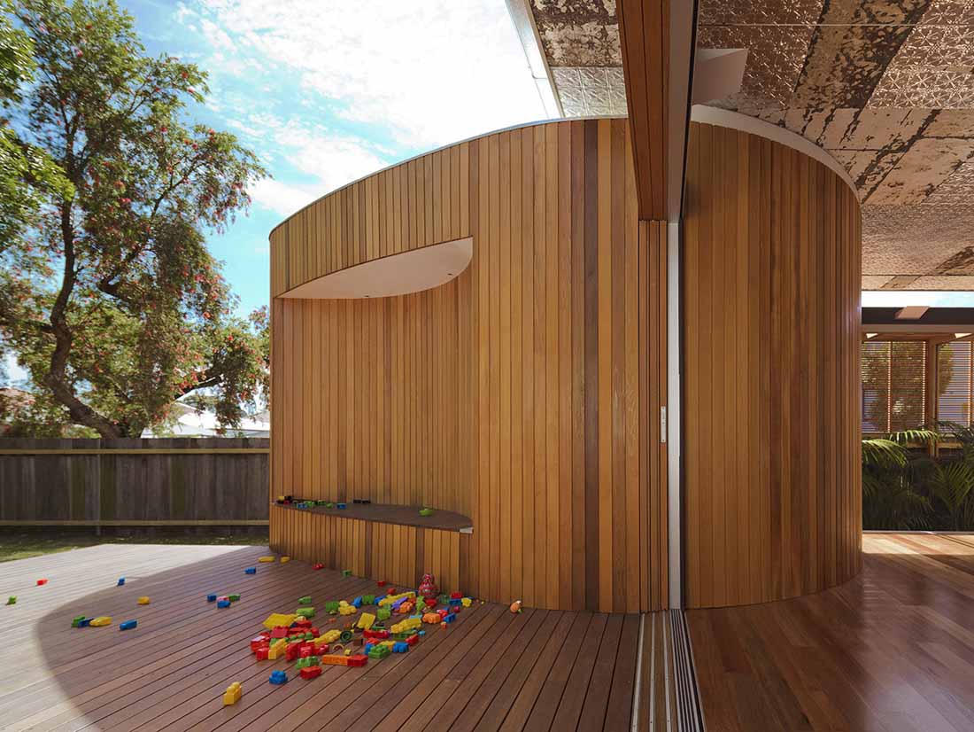大型推拉门无缝地隐藏在了蛋形的浴室和洗衣房中,从而将室内生活空间延伸到了外部环境中。隐藏式的可伸缩纱窗经过专门的设计,可在玻璃滑动门打开的时候对厨房和餐厅空间起到完全的防护作用。而当滑动门和可伸缩纱窗都完全打开的时候,门体便不再存在于人们的视野中,从而营造出一种置身于带顶的室外起居室之中的感觉。厨房操作台面带有延展搁板,可连接到室外的烧烤台。室外平台上铺有斑皮桉木地板,带有内置座位,将内部生活空间和外部花园以及及儿童游乐区域连接起来。