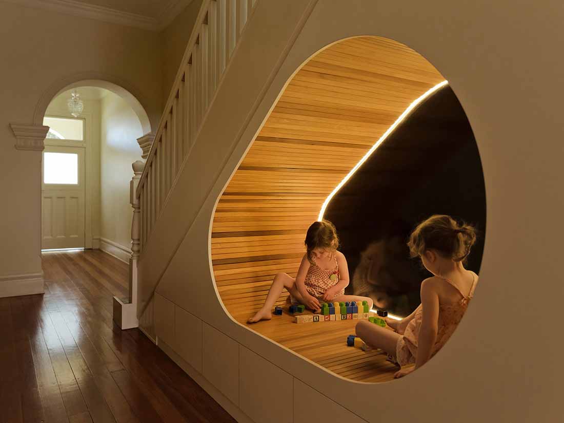 在设计过程中,建筑师给予了次要空间和日常中经常被忽略的空间很大的关注,希望通过彻底的调查研究,来探索这类空间可能会带给住户哪些便利。楼梯间下方的空间是本项目的另一创新性特色和成功之处。设计团队将楼梯间下方的空间改造为了一个休息区,并将其命名为“自修室(Study Nook)”。这个角落空间采用红雪松内饰面,设置着隐蔽的LED照明,为大人和小孩提供了休息和放松的场所。而随着时间的推移和家庭的成长与变化,该空间的功能也会发生相应的改变。自修室在形式和设计意图上都与位于主生活起居区之外的舱体洗衣房和浴室相呼应。通过这种强调次要生活空间的设计方法,家庭的日常活动空间发生了不小的转变,创造出一系列有趣的创意型场所。