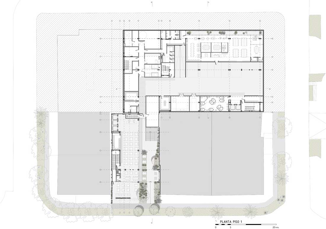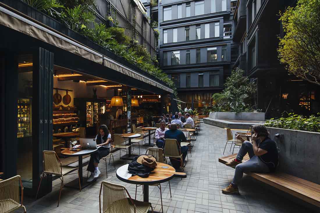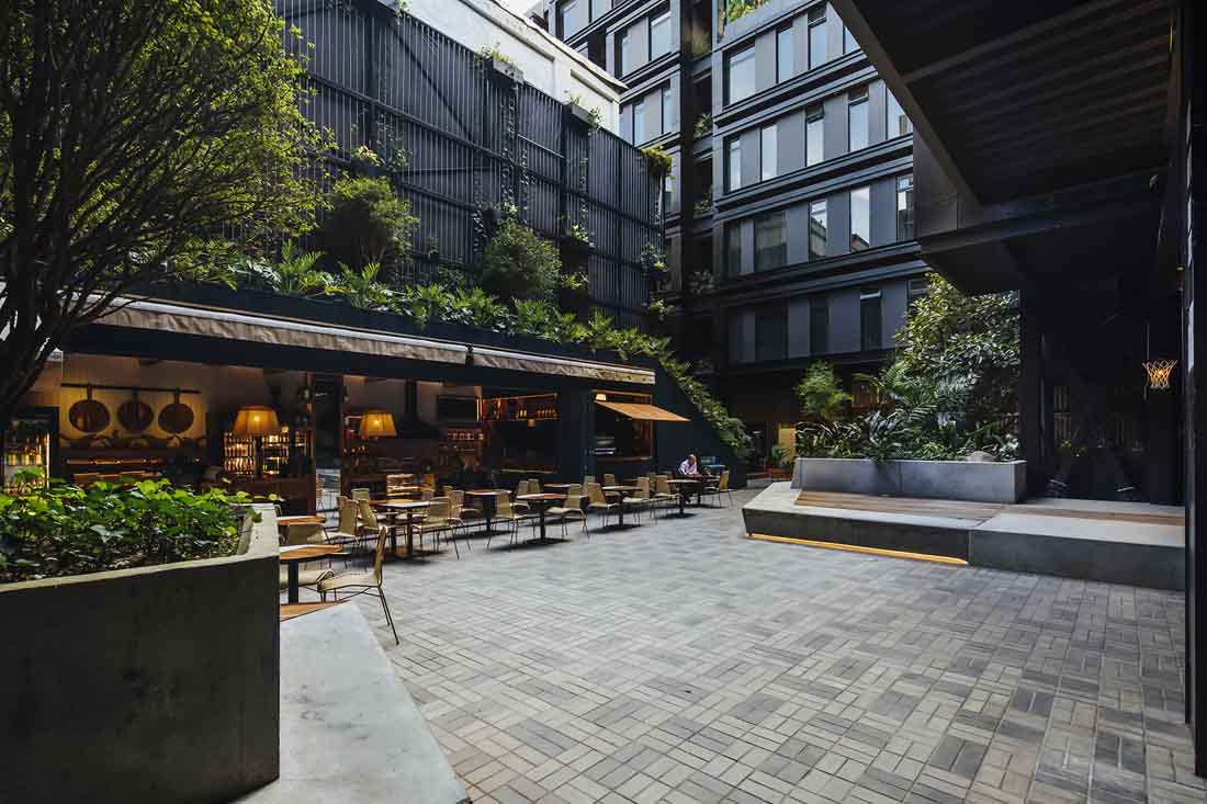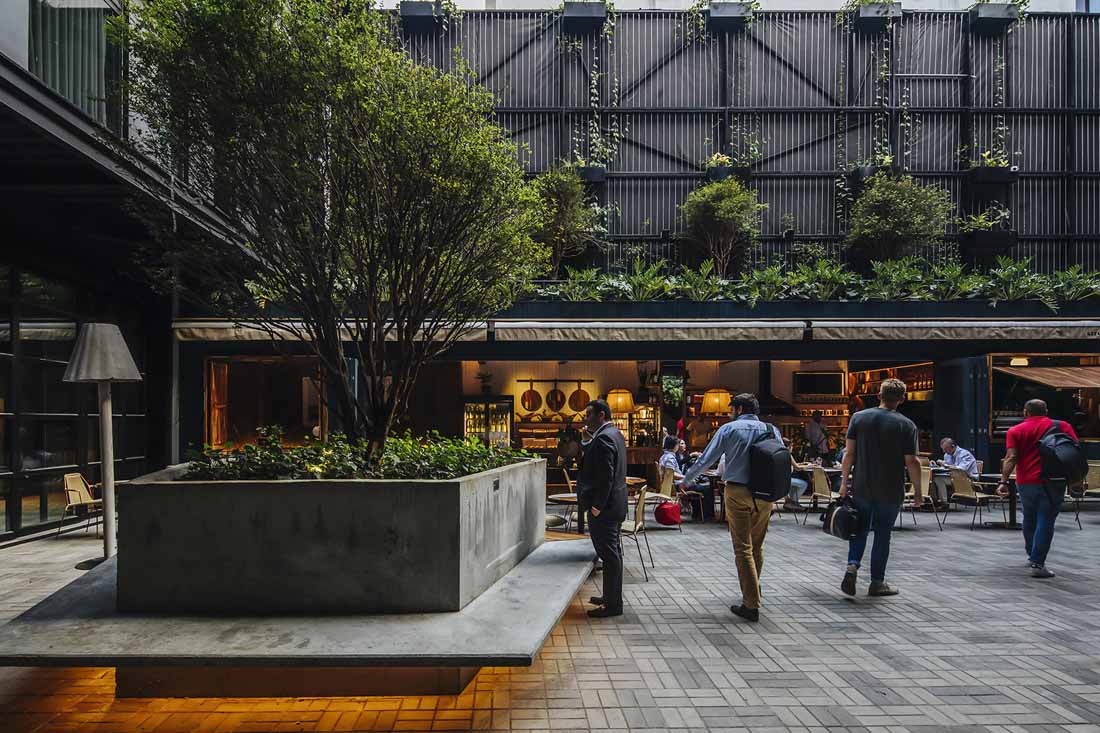 该酒店位于麦德林的一个布局方正的传统街区。新落成的建筑完善并打通了街区的结构,创造出一个便于人们通行的半公共空间,将步行通道、楼梯、庭院、裙楼、平台、露台和带顶广场融合在同一处场地。建筑本身扮演着城市交叉口的角色,多条路径提供了良好的渗透性,大面积的本地植物营造出清新怡人的环境。