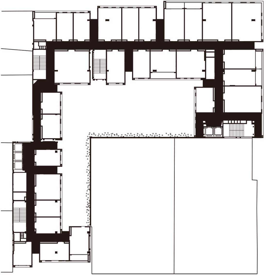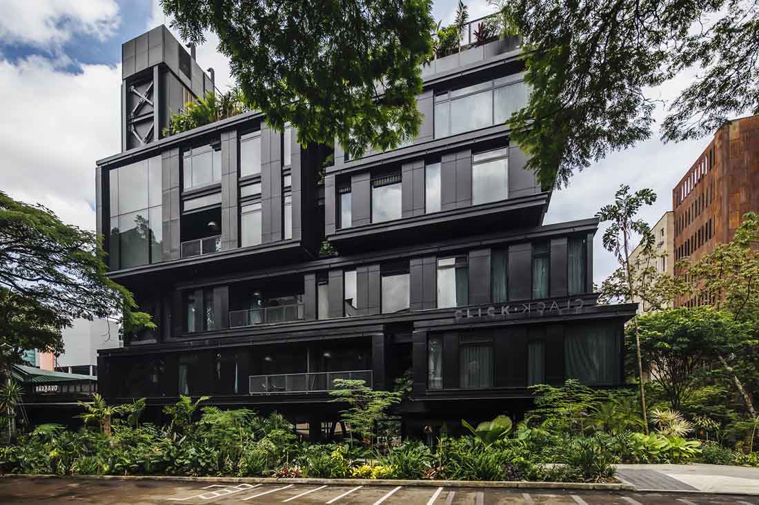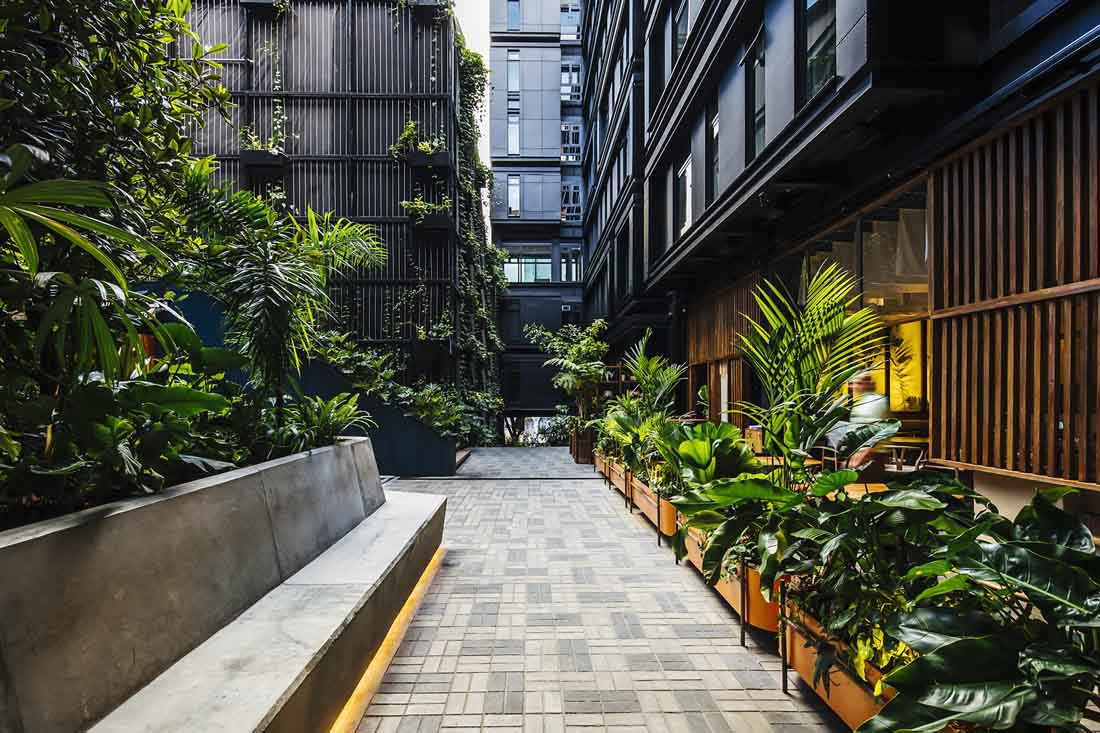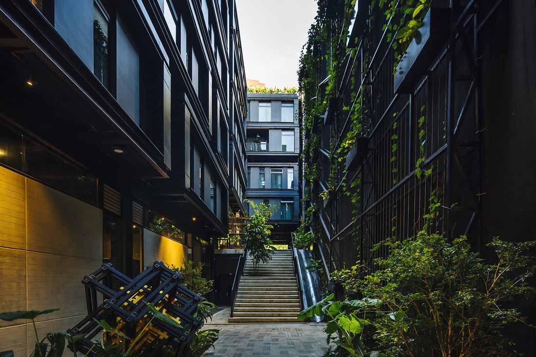 该酒店位于麦德林的一个布局方正的传统街区。新落成的建筑完善并打通了街区的结构,创造出一个便于人们通行的半公共空间,将步行通道、楼梯、庭院、裙楼、平台、露台和带顶广场融合在同一处场地。建筑本身扮演着城市交叉口的角色,多条路径提供了良好的渗透性,大面积的本地植物营造出清新怡人的环境。