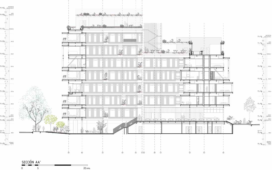 建筑的走廊引入了自然光线。高度不同的露台边缘种满了植物,提供了面向城市的观景点:朝东可以欣赏到山峦和El Poblado街区内的建筑,朝西则可以望见山谷。酒店内部的活动设施也非常丰富,包括游泳池、酒吧、餐厅和一个露天电影院。