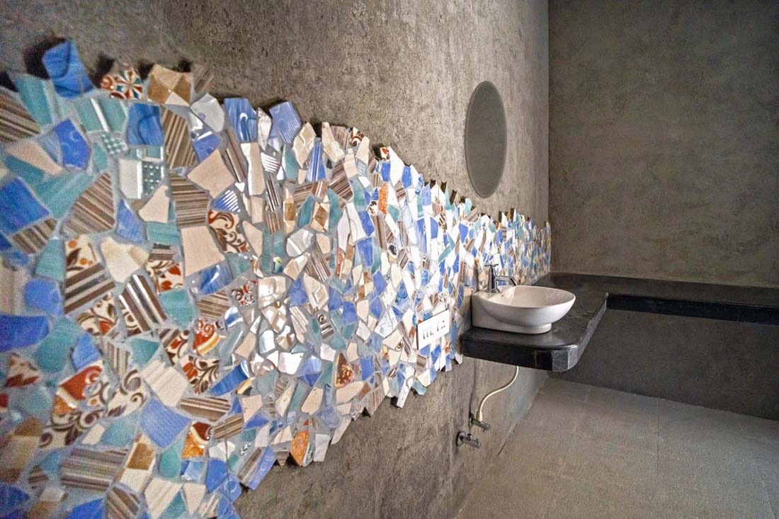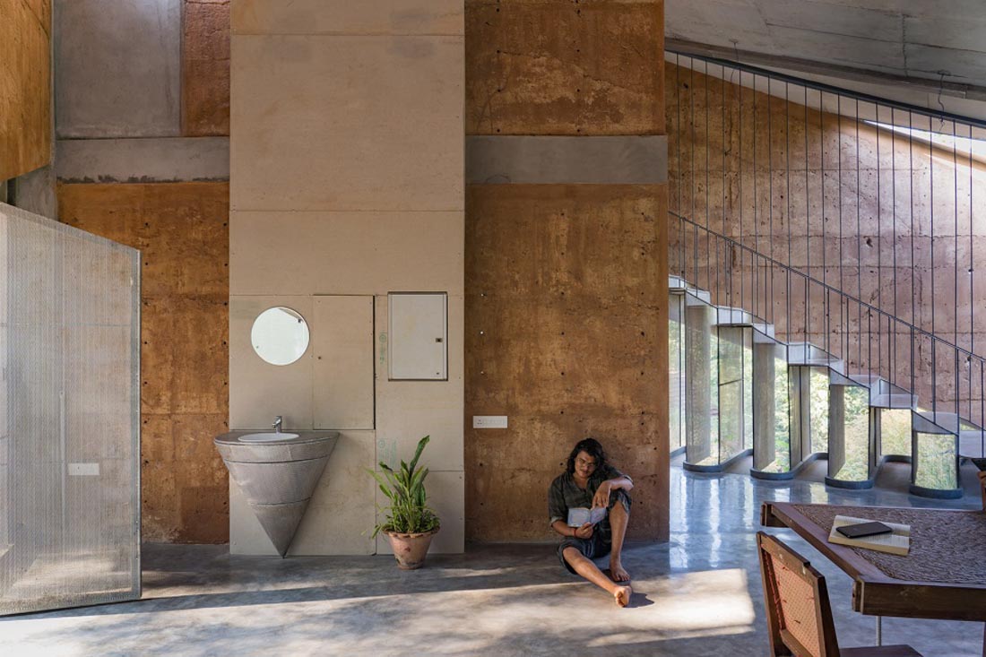 外围护结构的墙体由基地的土壤材料打造而成,虽然略显粗糙,但在保温隔热和抵挡直射光方面有着非常好的性能。同时,这种就地取材的做法也完全符合可持续建筑的理念。具体来讲,基地的开挖一方面为雨水收集系统和地下室的设置提供了空间基础,另一方面也为建造外围墙提供了充足的土壤材料。但实际上,因为土壤之中混入了过多的沙砾和碎石,由挖掘所带来的土壤并不适于泥土墙砖的制作。因此,项目团队使用了建造闭合式碎片墙体的专利技术,打造出一系列由场地开挖产生的“废料”所构成的墙体。
