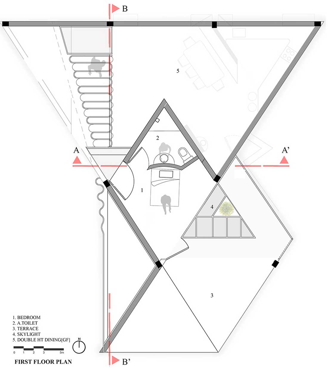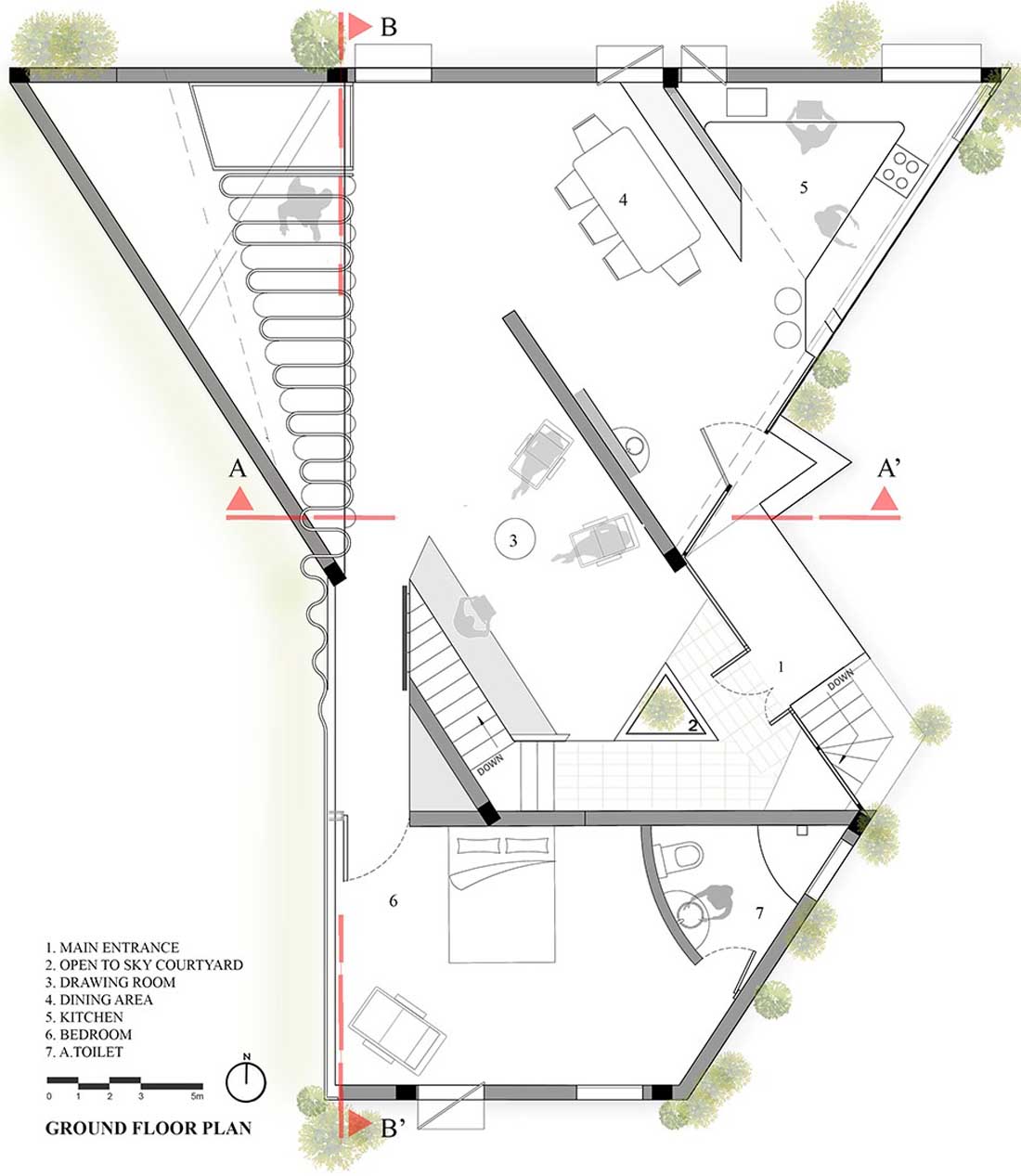 项目基地朝向西方,这就要求建筑师对建筑的遮阳设计进行细致而深入的推敲,以避免住宅受到西晒的不利影响。因此,设计团队沿着场地的边界建造了倾斜的墙体,并由此催生出“将住宅打造为一座山巅”的设计概念。
