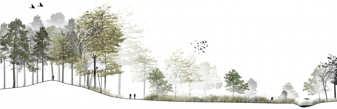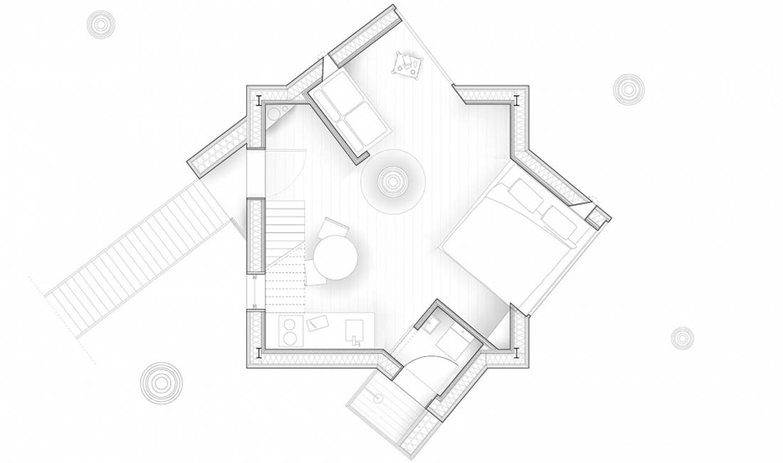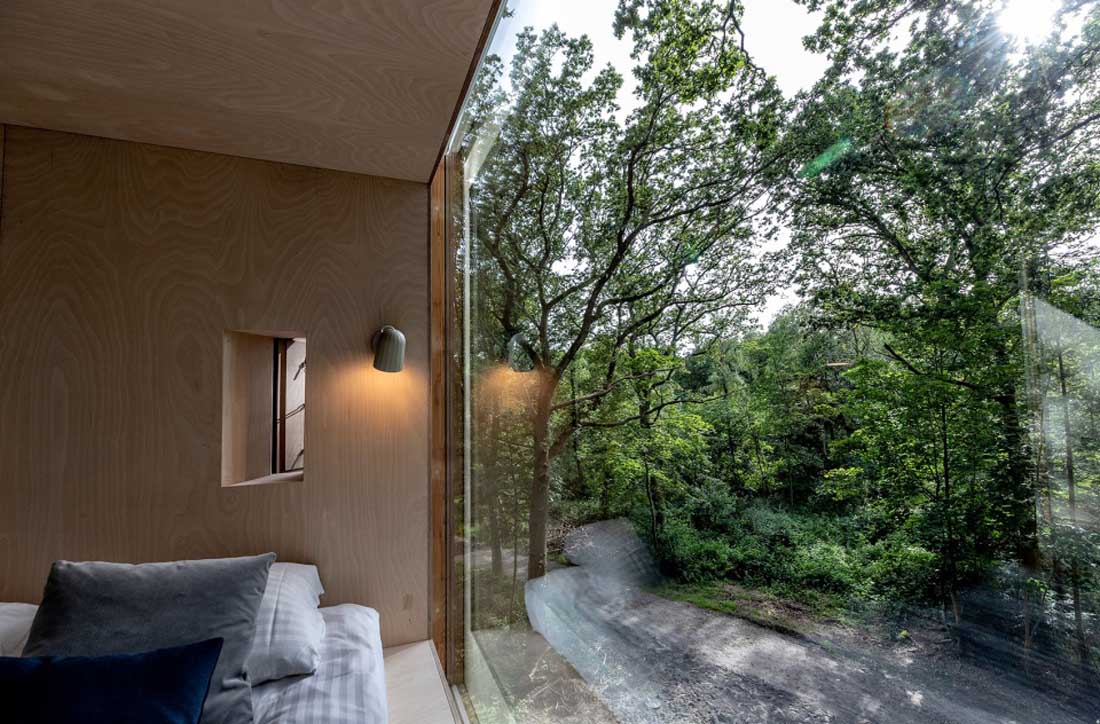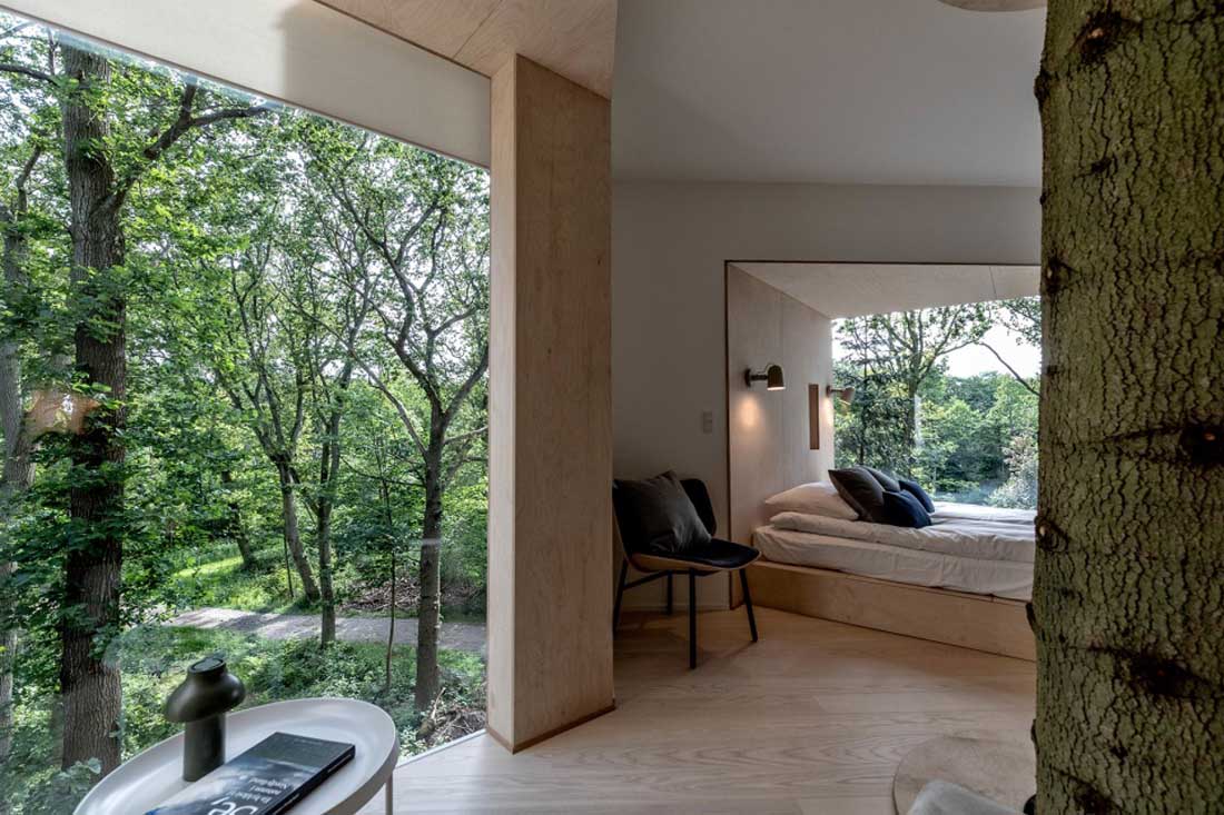 每间木屋最多可以住4个人,树木从木屋中部生长而出。当你走到屋顶平台的时候,仿佛是爬到了树冠顶部。在房间里,透过观景窗,人们可以欣赏不同角度的森林景色。