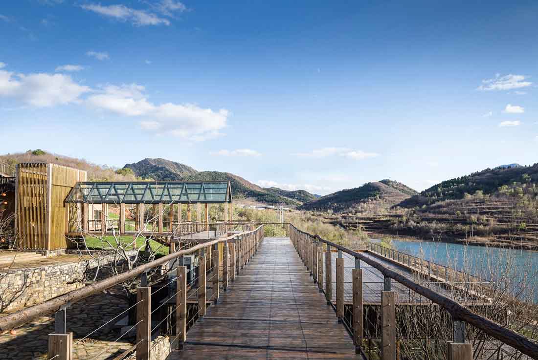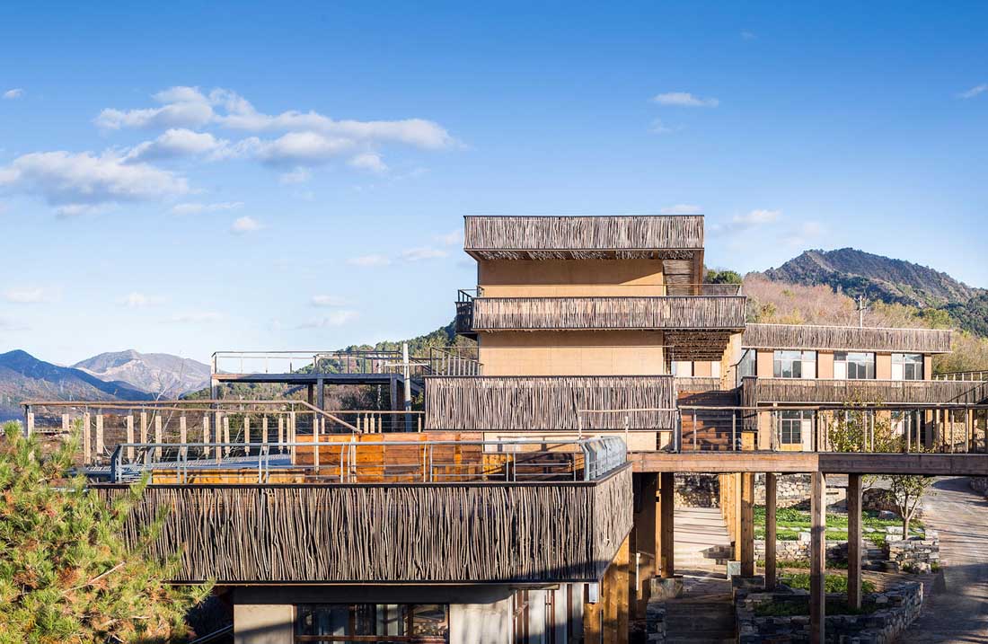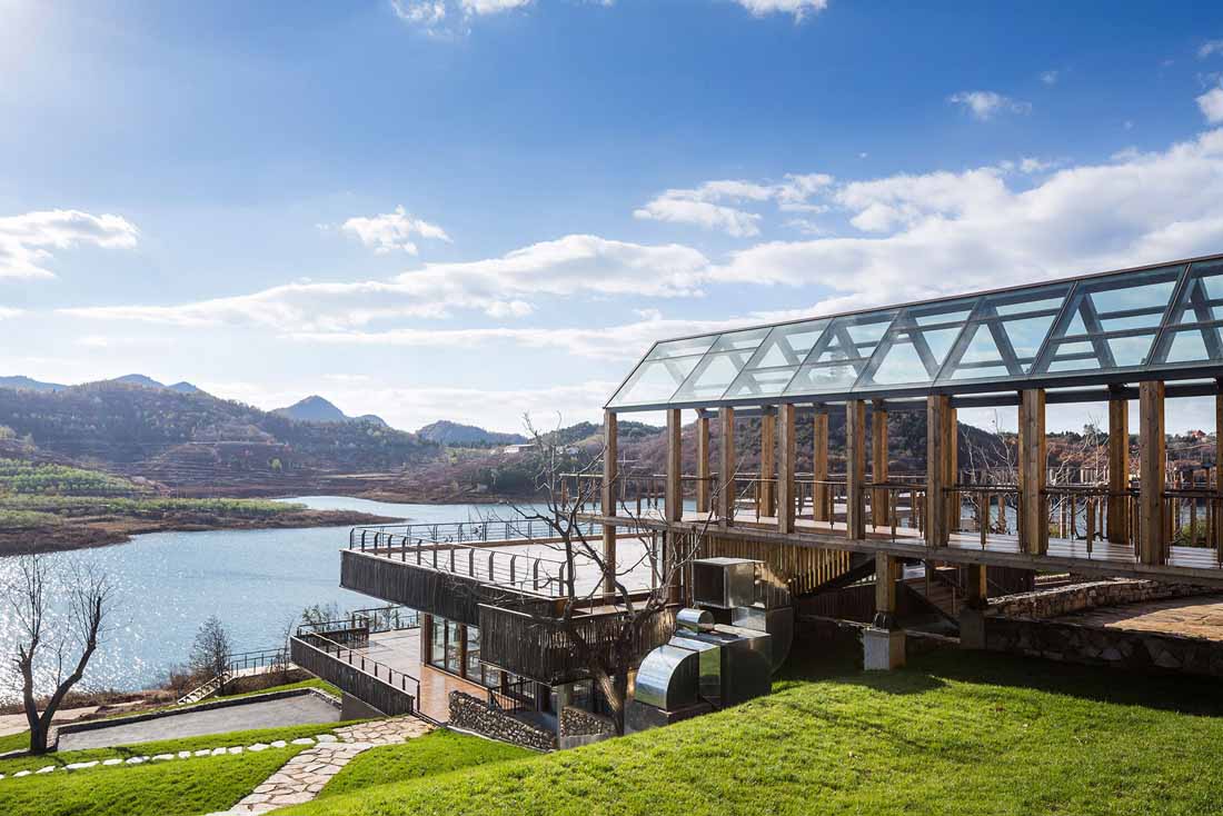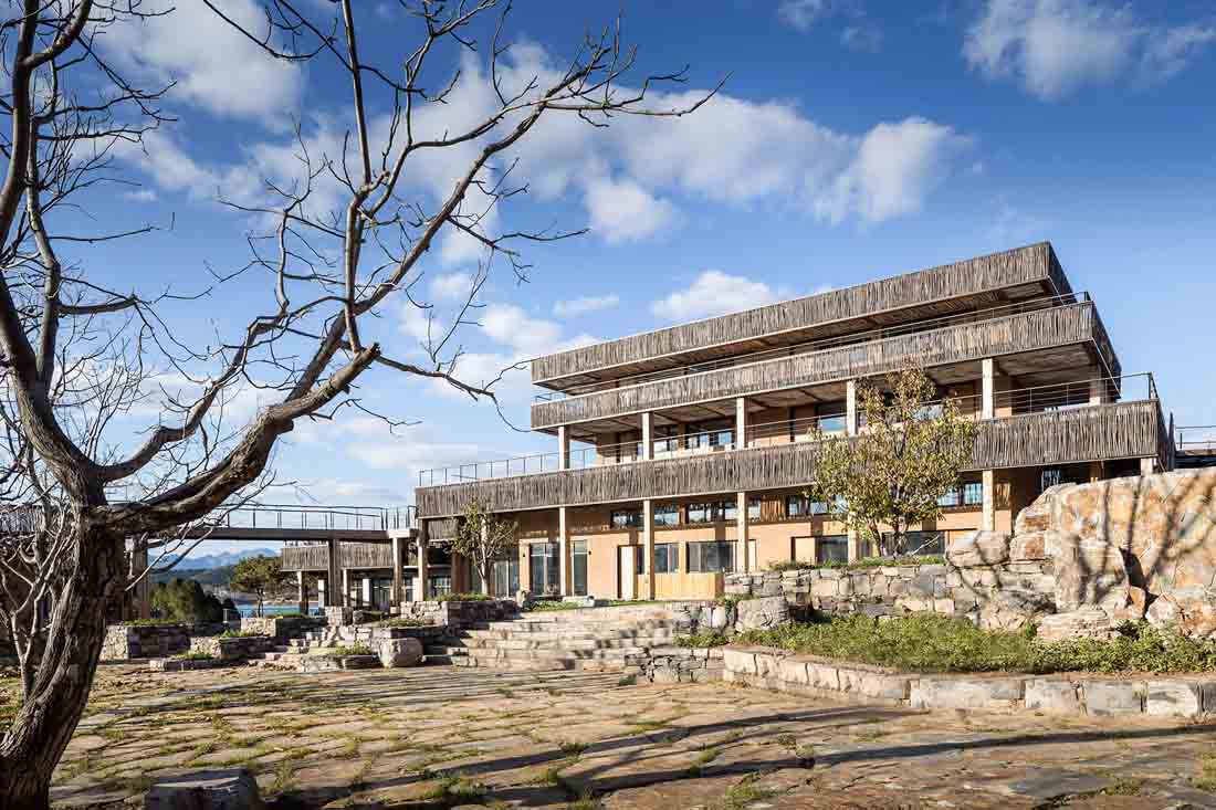 溪园酒店项目位于北京平谷城区15公里外的金海湖国际度假区内。酒店所在半岛比邻水域中心岛,与景区中心建筑湖光塔对望。场地依山傍水,前身是一个废弃的度假庄园,经过扩建改造如今重新定义为野奢高端度假目的地。