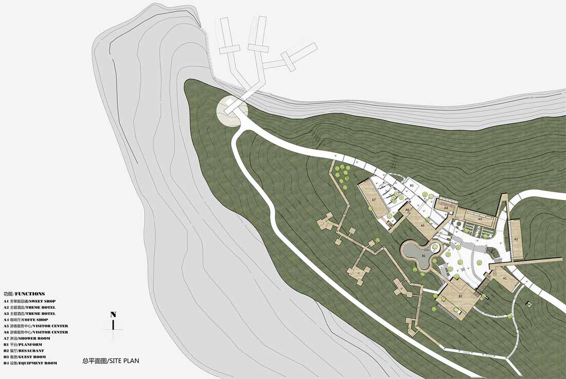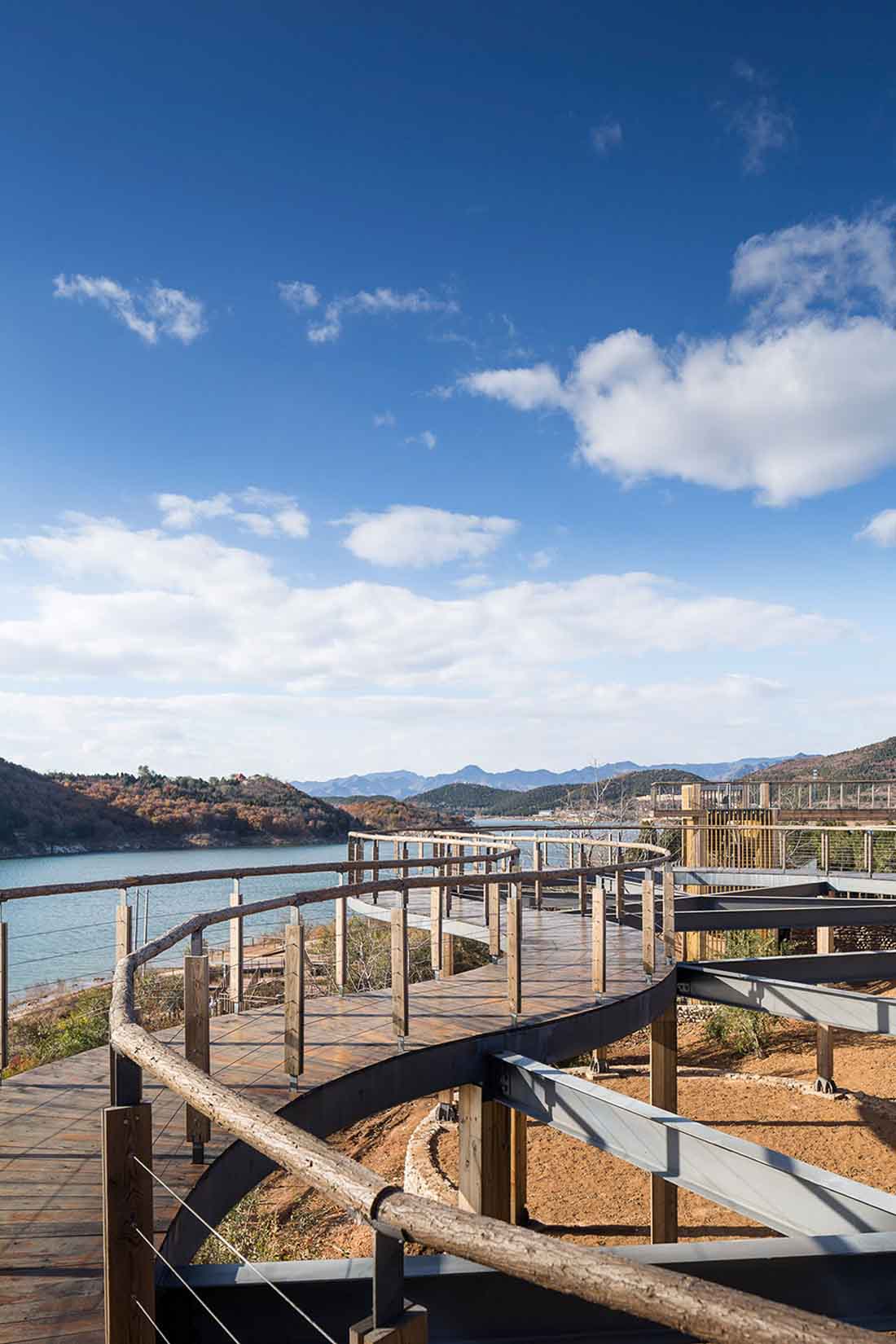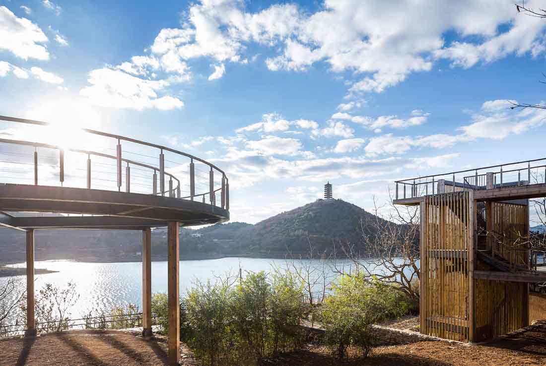在对主体建筑元素重置之后,设计师对场域内不同建筑的关联也进行了新的连接规划,通过曲直相应、高低错落的廊道把原本孤立的各个建筑通连接起来。廊道在平台与各个功能区当中穿插交通,上下流动,为游览者创造出景观最大化的观赏路线。从房间到露台,居住者可以通过游廊在私领域和公共空间内自由穿梭,远观山望塔,近戏水闲庭。
