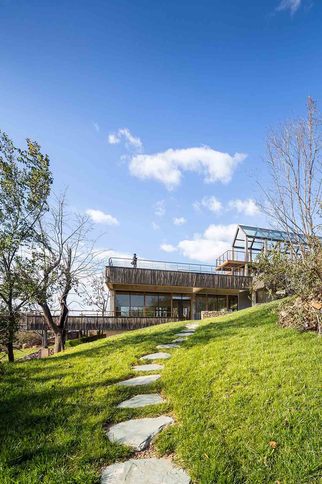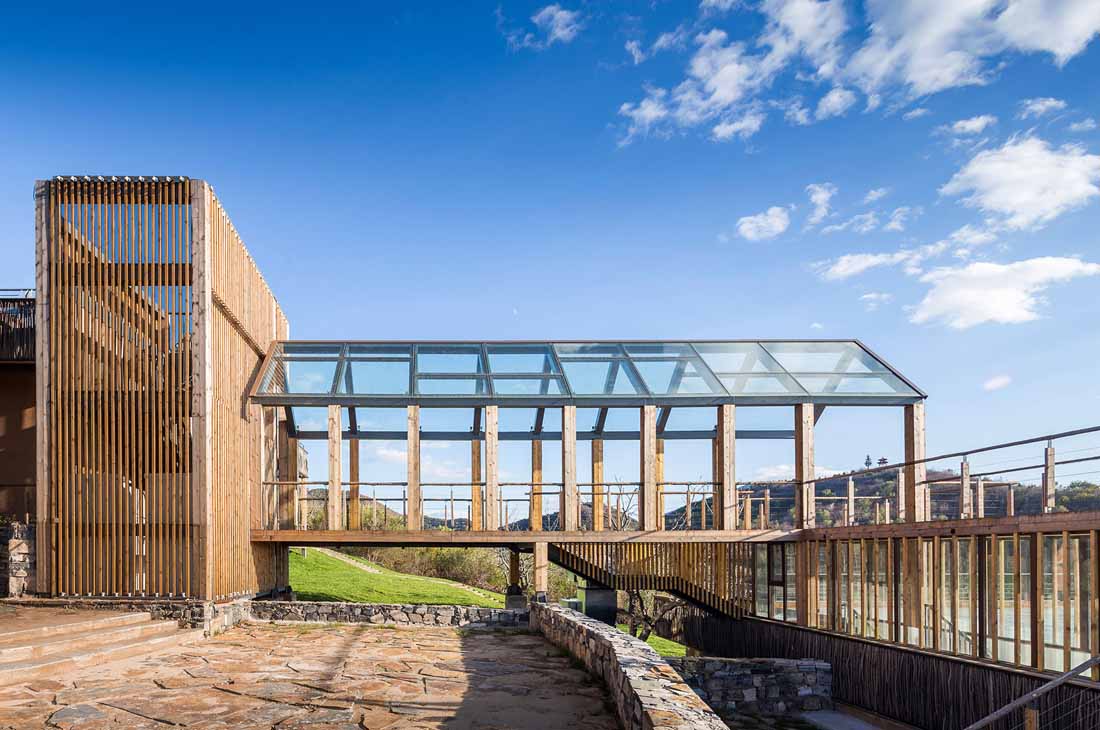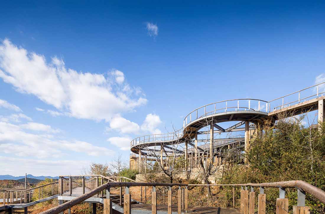 为了软化直线和方形的空间构图,设计师在观景栈道部分使用了柔和的曲线设计,打造出一个流动蜿蜒的云形连廊。它在两个不同高度之间形成连接,优化了空间和景观的层次,同时借此埋下伏笔,体现出设计师主张的“有无相生”设计哲学。屋顶露台、观景平台以及木栈道之间形成一个庞大的栈道游览体系。四周几乎尽数保留了当地原有不同物种的树木,游人穿行期间,四季均有果实成熟,将是一个不断发现惊喜的过程。