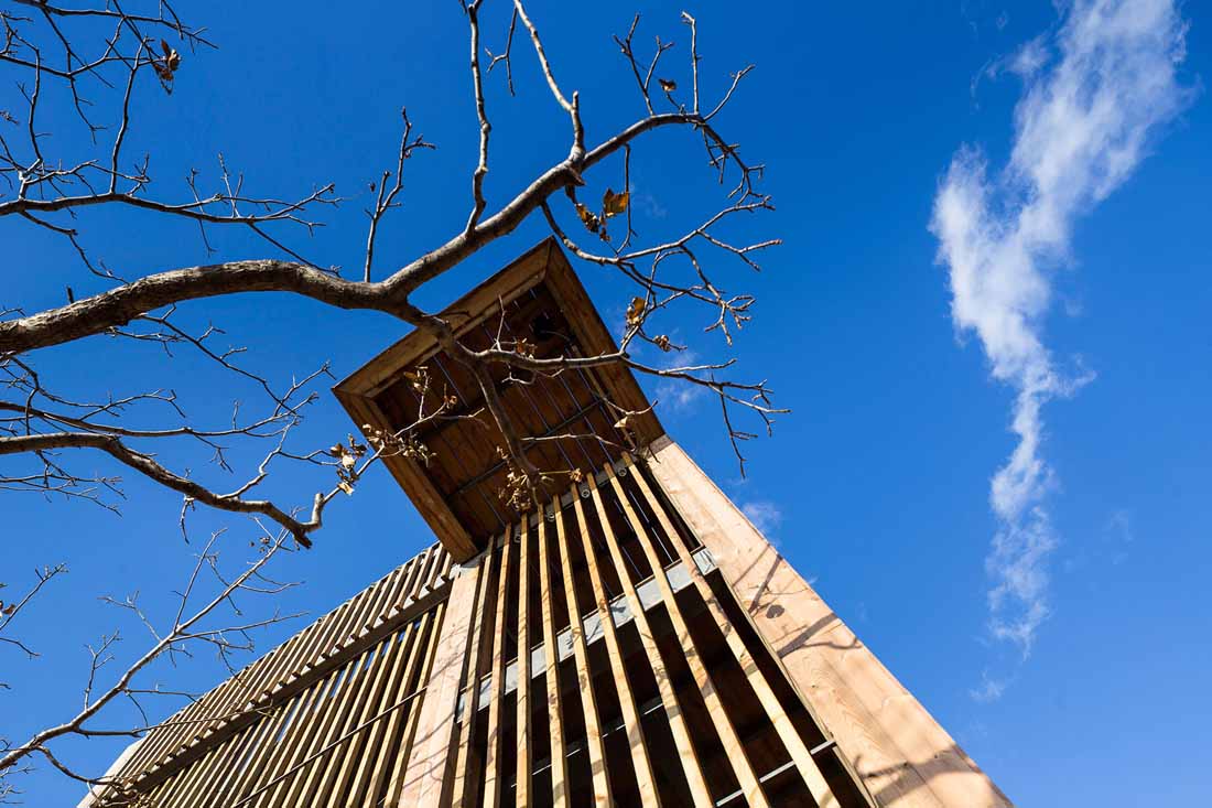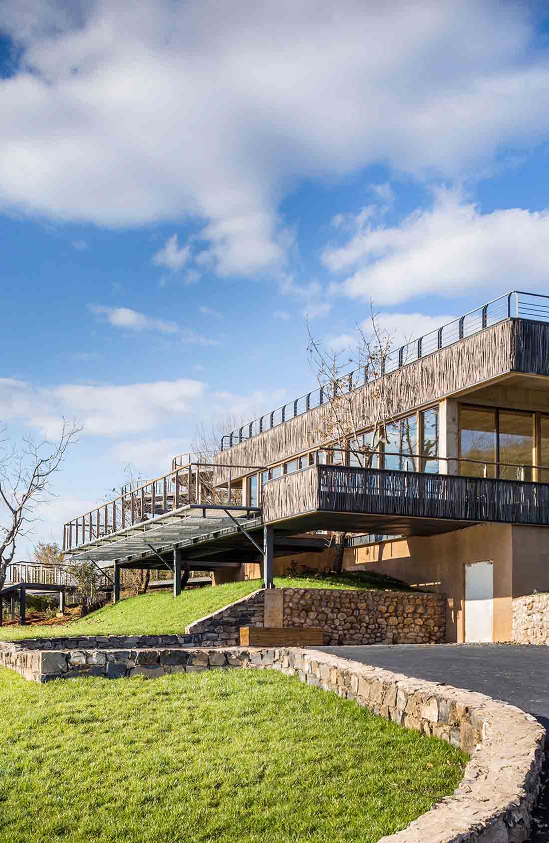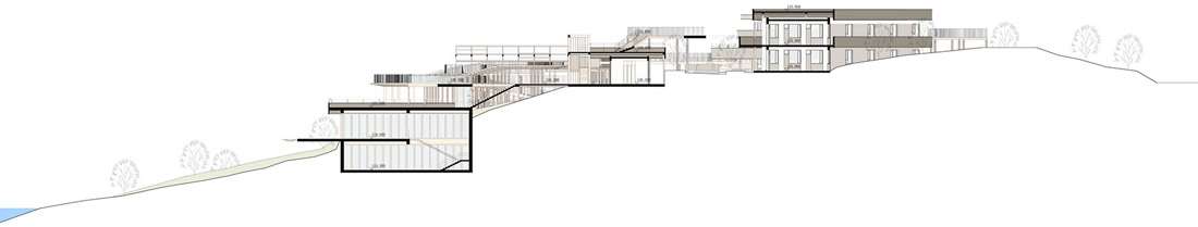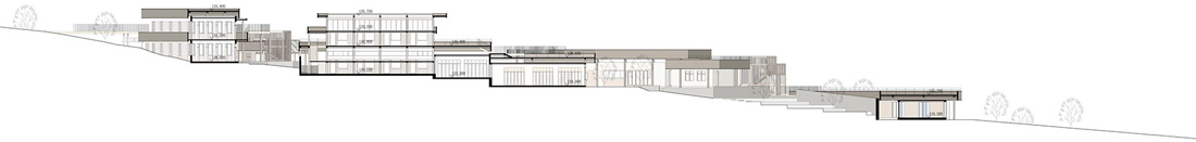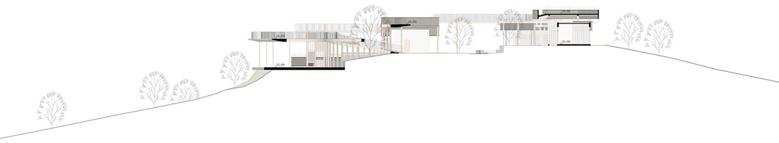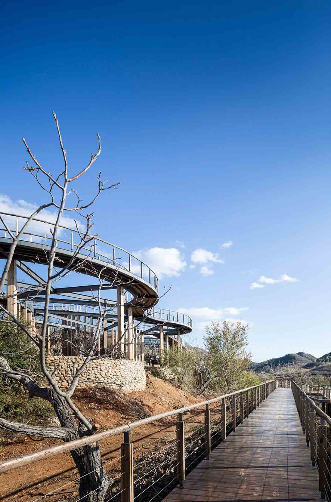 为了软化直线和方形的空间构图,设计师在观景栈道部分使用了柔和的曲线设计,打造出一个流动蜿蜒的云形连廊。它在两个不同高度之间形成连接,优化了空间和景观的层次,同时借此埋下伏笔,体现出设计师主张的“有无相生”设计哲学。屋顶露台、观景平台以及木栈道之间形成一个庞大的栈道游览体系。四周几乎尽数保留了当地原有不同物种的树木,游人穿行期间,四季均有果实成熟,将是一个不断发现惊喜的过程。