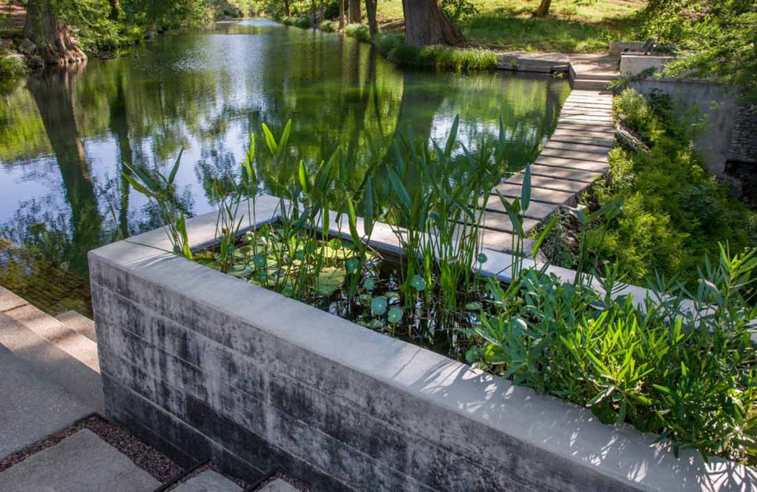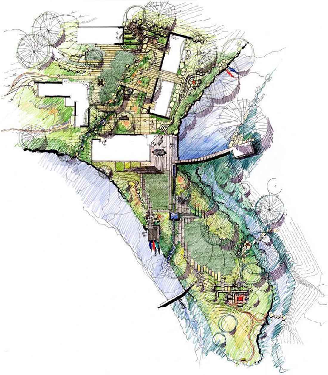 茂密的落羽杉三三两两地散布在溪畔,不远处则是新建的农舍建筑群,精心设计的室外活动场地突出了场地丰富的空间层次,而应客人要求而设的游憩草坪、户外排球场、冥思场所、码头、步行道以及水景、火景元素则散落在园地的四周。繁盛生长的本土植被以及诸如石灰岩、砂岩、钢材和混凝土板等耐久的硬质景观形成了边界,划分着不同的活动场地,也从材料上与建筑相呼应。