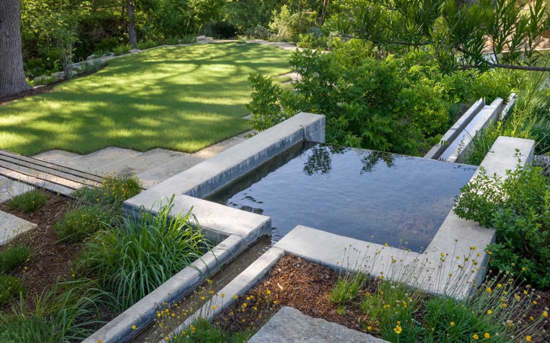 阶梯式的花园台地和石板铺成的道路连接起位于不同高度和角度的四栋建筑单体。在初始的设计方案之中,土木工程师在庭院的中部设计了一个集水池以收集雨水,而景观设计师在介入后对方案进行了调整,如今,具有清洁能力的水生植物在雨水花园中繁茂的生长,在外侧,一系列积水坝层层跌落,清洁、过滤着即将汇入小溪的雨水。一道石坝拦截在溪水的上游形成了一个池塘,潺潺流水从一阶阶的踏步中溢出,发出淅沥的声响。溪水流过阳光下的石坡,也经历了一次来自自然的紫外线消毒。不同的材料选择带来了丰富的变化,而一致的形态却又呼应着散落的建筑以及位于其后的有机果园与菜园,形成了统一的视觉效果。