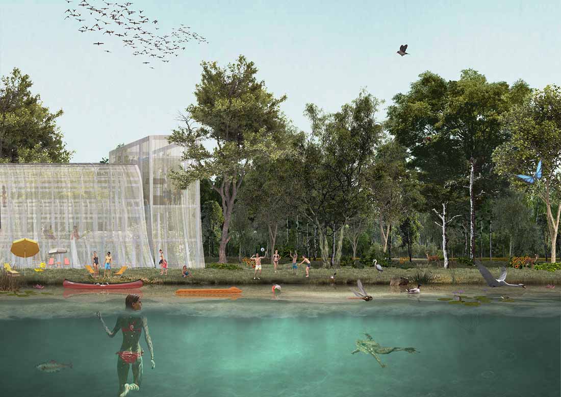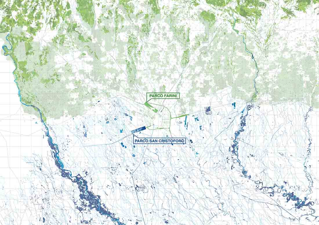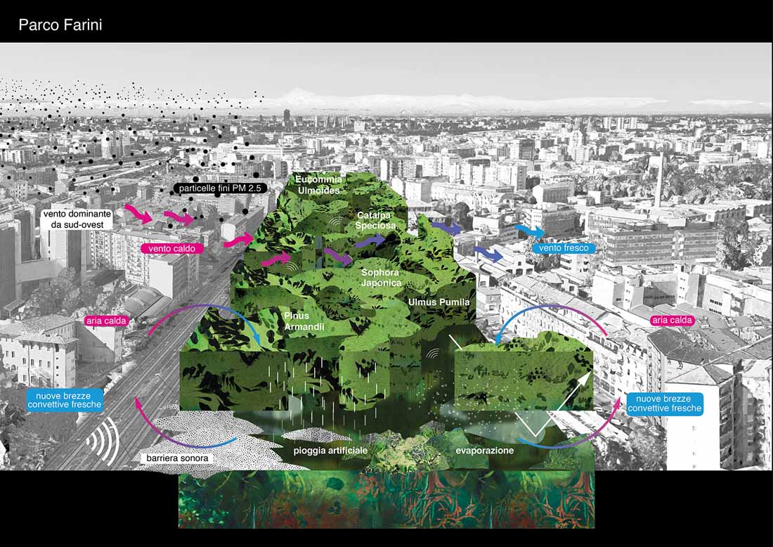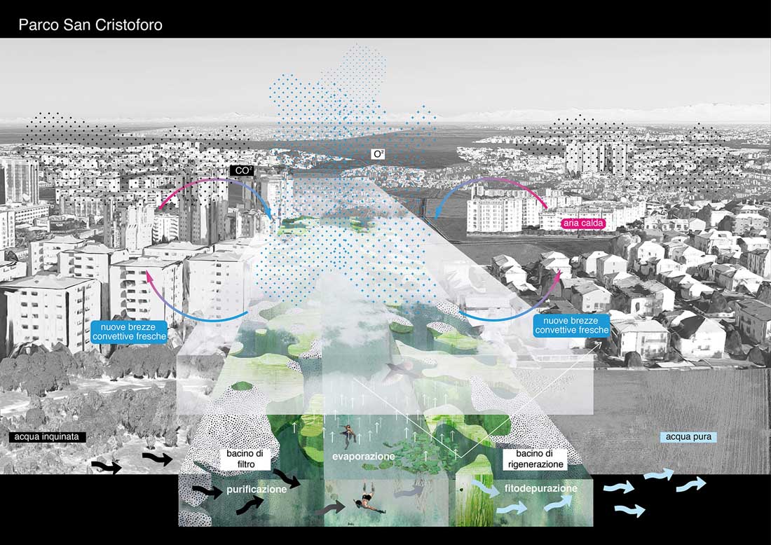 Agenti Climatici方案将Scalo Farini和San Cristoforo两处场地分别规划为绿色区域和蓝色区域,二者将同时起到净化生态环境的作用:绿色区域包含一个大型公园,可以冷却来自西南方向的热风并净化含有有毒颗粒的空气;蓝色区域包含一个巨大的盆地,能够对地下水起到清洁作用,同时为人类和动物提供适宜的自然景观。通过提供清洁的空气和水,这两个新的区域将应对都市规模下的气候变化和污染问题,使米兰的生态环境重获生机。