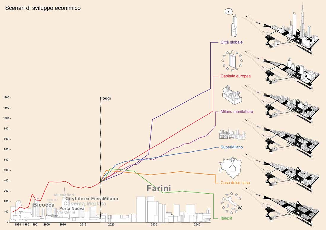 在这一新的体系中,公共空间(包括水、绿植和桥梁)是固定的,而建筑物则是剩余且不确定的。Farini的发展规模取决于城市未来的经济状况,它需要通过创造一个高弹性的空间框架来应对来自国内政治乃至全球经济的冲击。