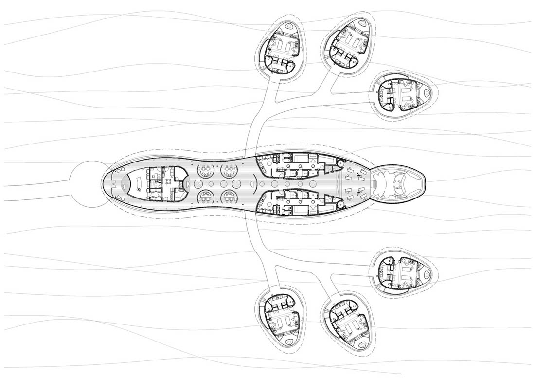 该岛被一个大的“珊瑚礁”所环绕,并由几个不同的生态区定义:珊瑚、海滩、沿海的丛林。这些区域成为创建体验计划的基础,该计划将引导客人完成发现和意识创造的过程。每个区域都有独特的锚固活动:珊瑚区域设有水上露天剧场和标志性水疗中心,海滩区域有两家标志性餐厅,丛林区域具有自然发现中心和弹出式咖啡馆,沿海区域具有潜水中心。
