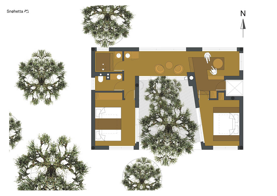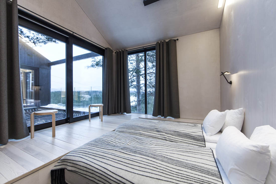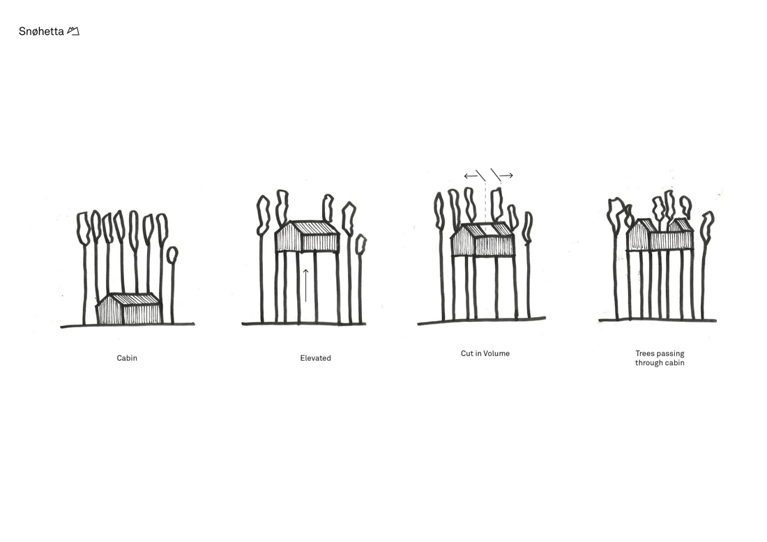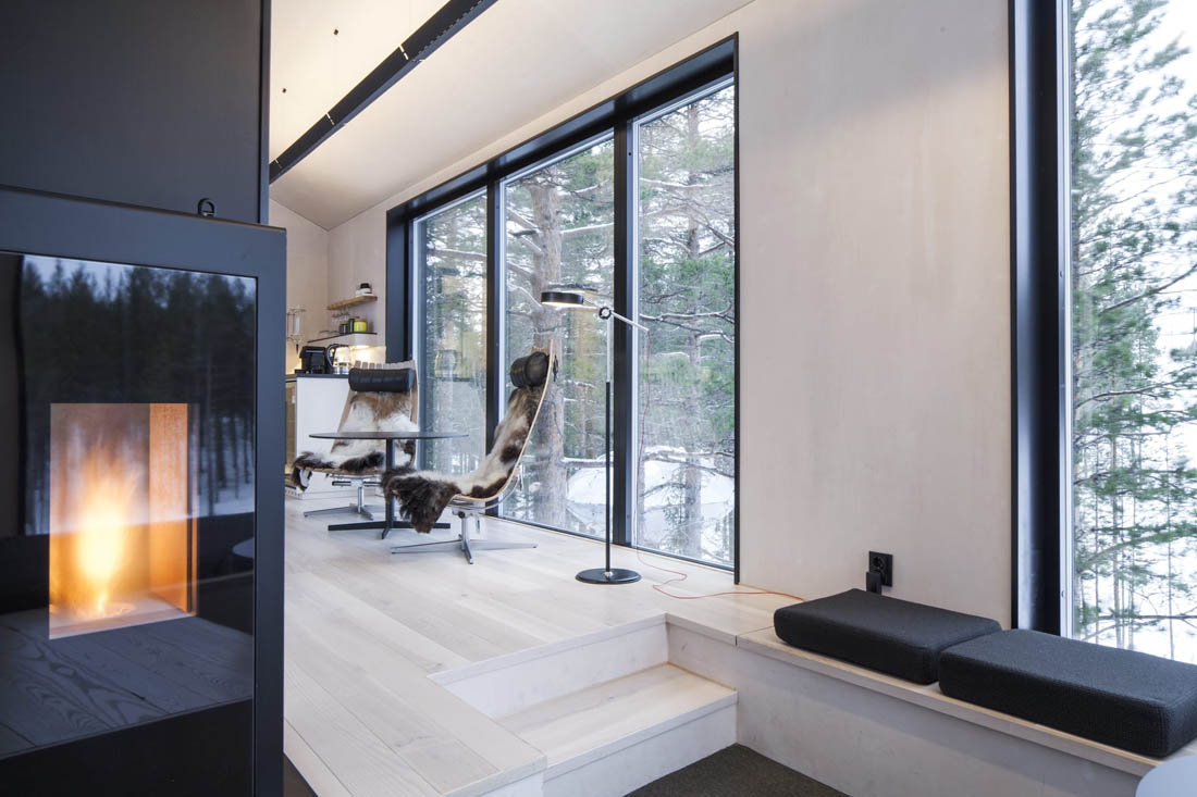 小屋共由十二根柱子支撑着,减少了树木所承受的负荷及其对周围森林的影响,这给人一种登高和失重的感觉,并保证了其稳定性。作为一个传统的北欧小屋,木立面覆盖着松木板,其表面被灼烧过,形成了一个黑暗且免维护的立面。室内地板由灰木制成,内墙则采用了桦木胶合板。与浅色木制家具相得益彰的是,内部与深色的外部形成了一种金色北欧对比。