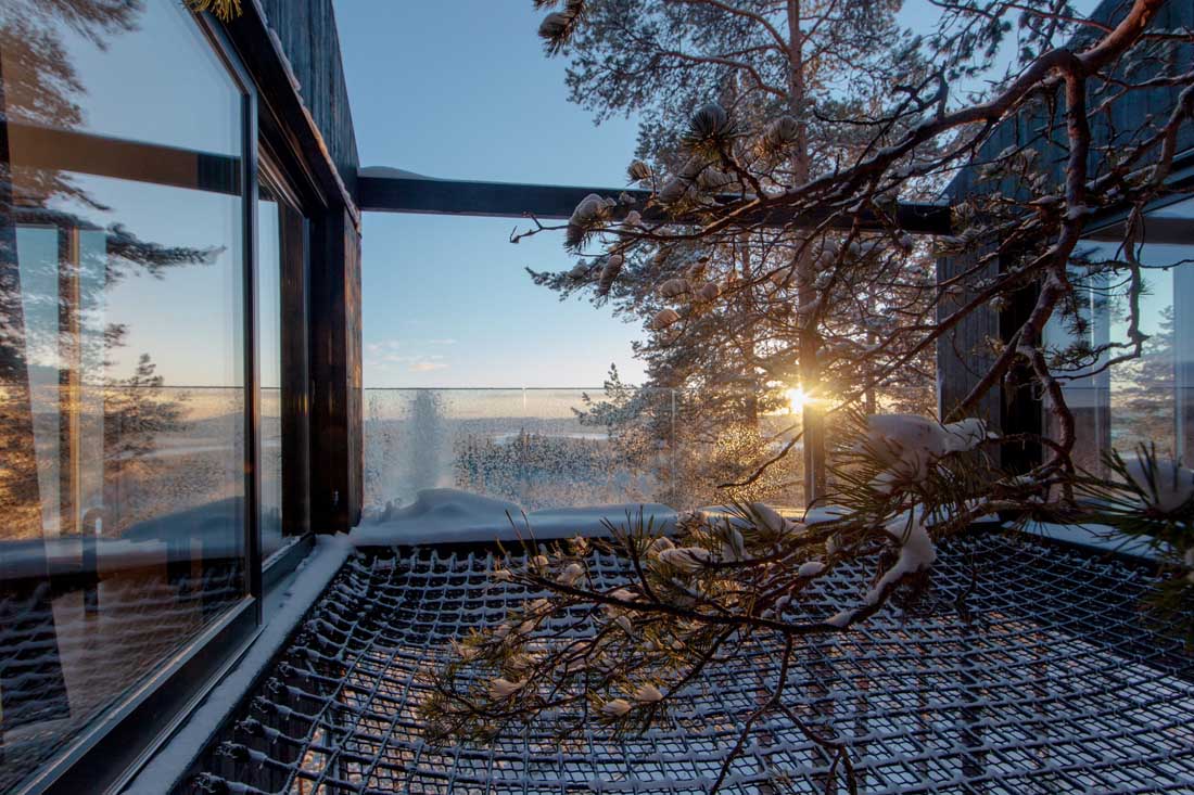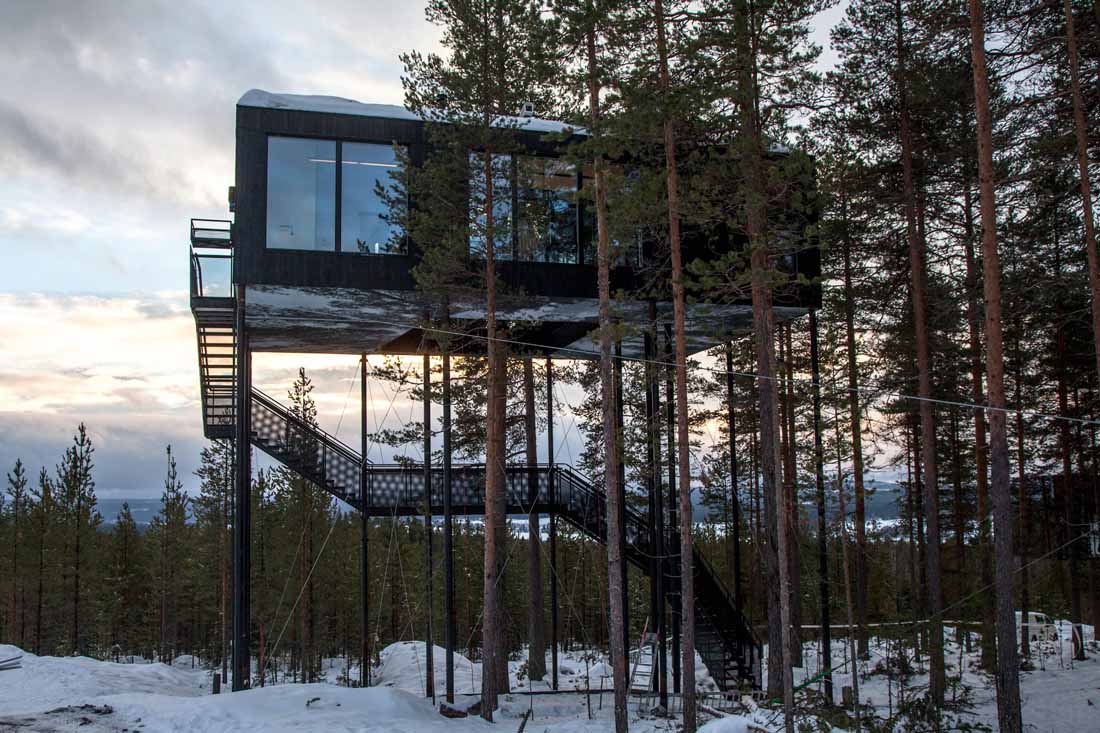 在瑞典北部高大的松林中,三色树干一直延伸到高耸的树冠,就这样,又一家著名树屋旅馆诞生了。酒店盘旋在离地面十米处的树梢,为住客提供了一个眺望Lule河的惊喜树梢之旅。根据周围的自然环境,酒店以大窗户、悬在森林地面上的网状露台和贯穿小屋的一棵树为特色,模糊了室内和室外的界限,小屋也因此成为了森林的一部分。