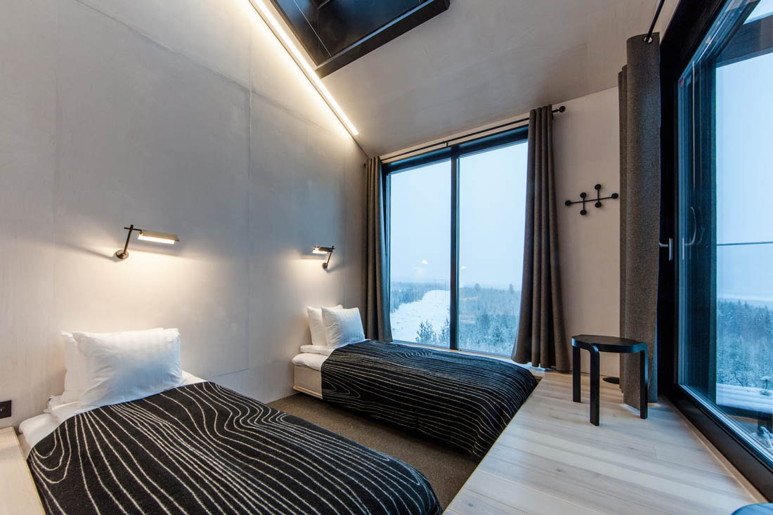 “自然的房间”的体验始于从森林接近小屋的时候。在接近树的底部的地方,出现了第六面,整个小屋的景色逐渐消失,这个面正是小屋的底部,12 x 8米的表面覆盖着一大片黑白色的树木,这些树木一直延伸向天空。楼梯将客人带离地面进入舱内,还有一个小电梯用于运送行李。