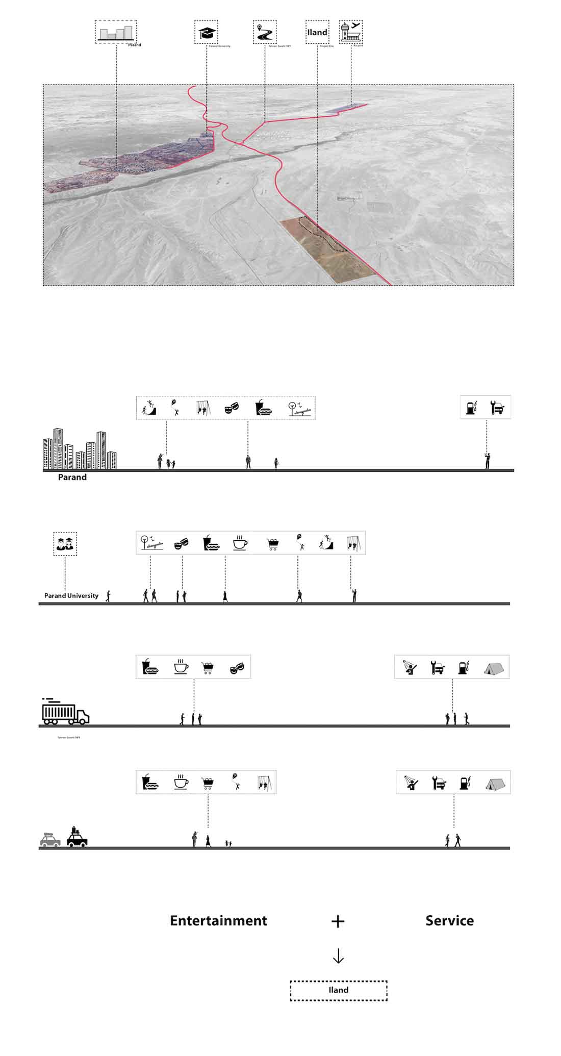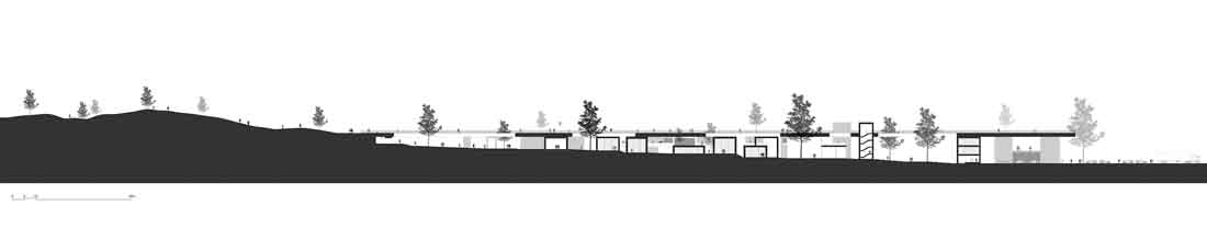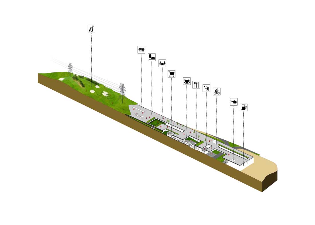 根据功能而设计的综合体,同时响应了用户的社交和娱乐需求,最终形成了一个凌于场地主要活动空间之上的社交平台。为确保形成综合体统一的整体形态。这个平台将吸引许多不同兴趣的人,平台的某些部分还可能会被用作附近拉力赛道路的观景台。