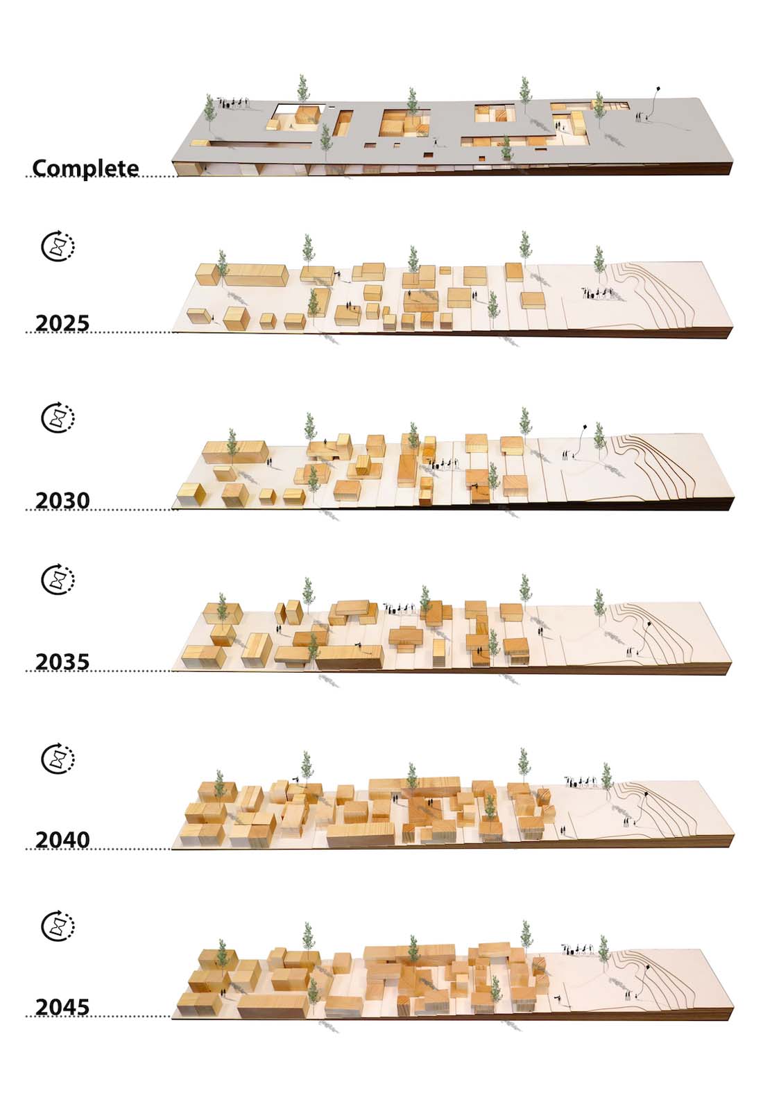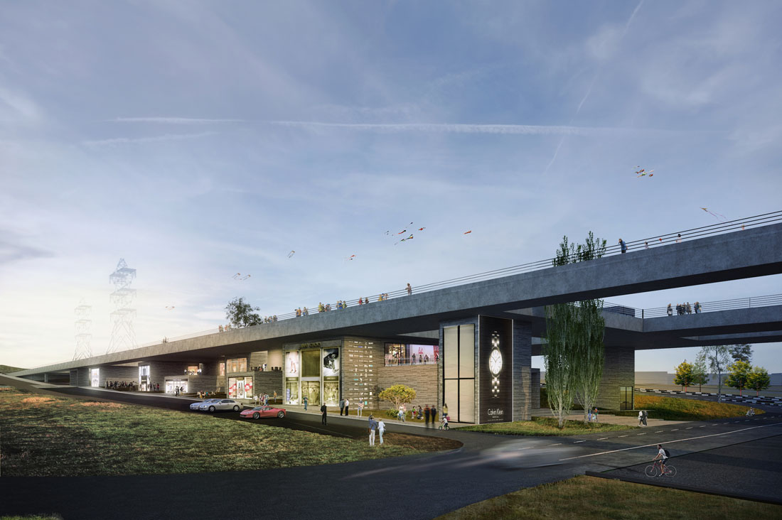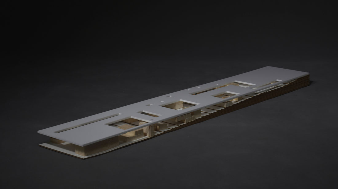 在平台下方,建筑体量将逐渐增加,创造出综合体的功能空间。而这些空间所在的高度各不相同,还可以根据现有的需求随着时间的推移进行转换或扩展。其中一些体量有形成结构以及平台和底层之间的垂直循环。