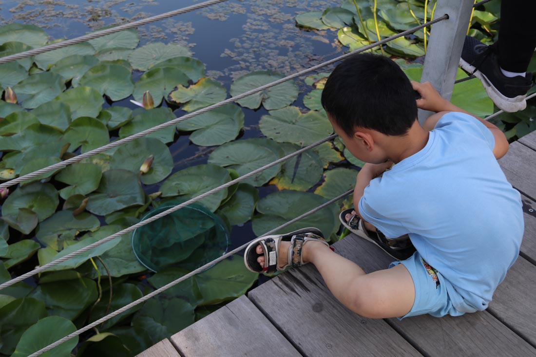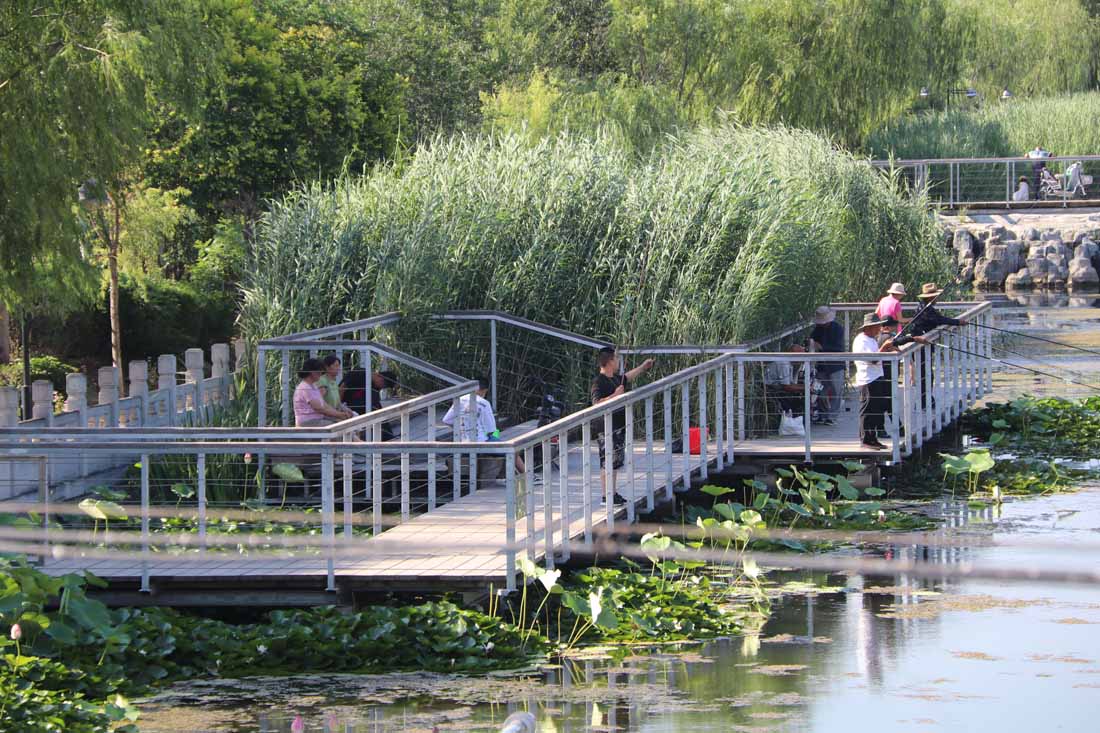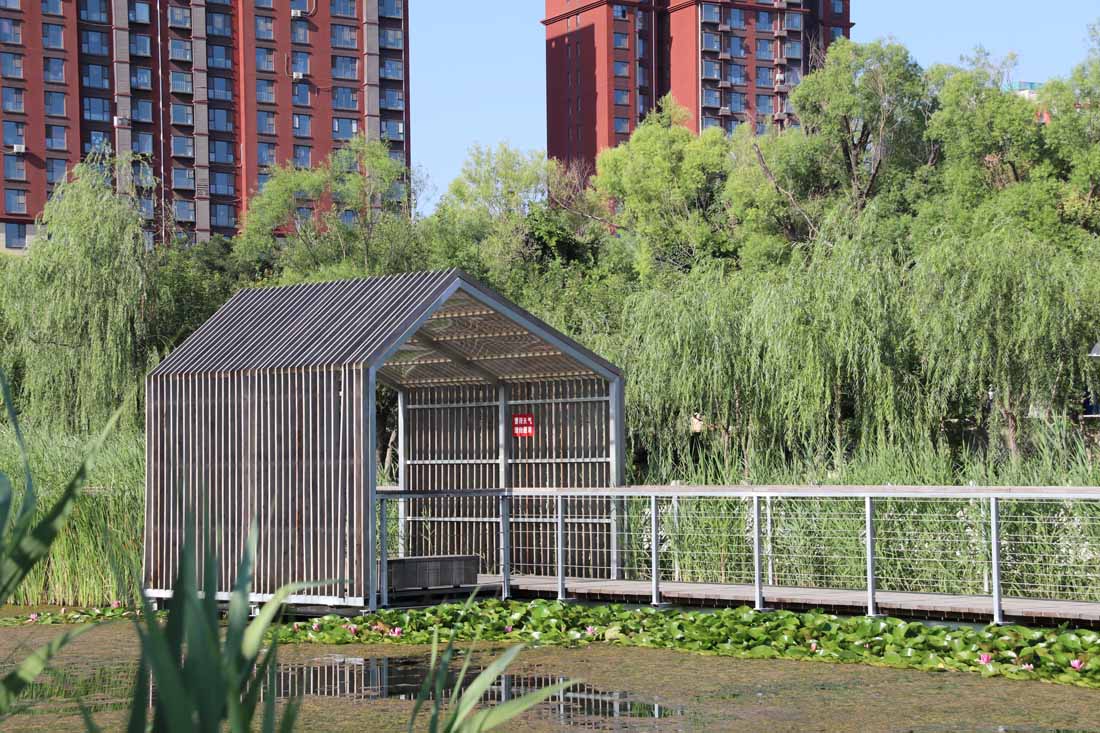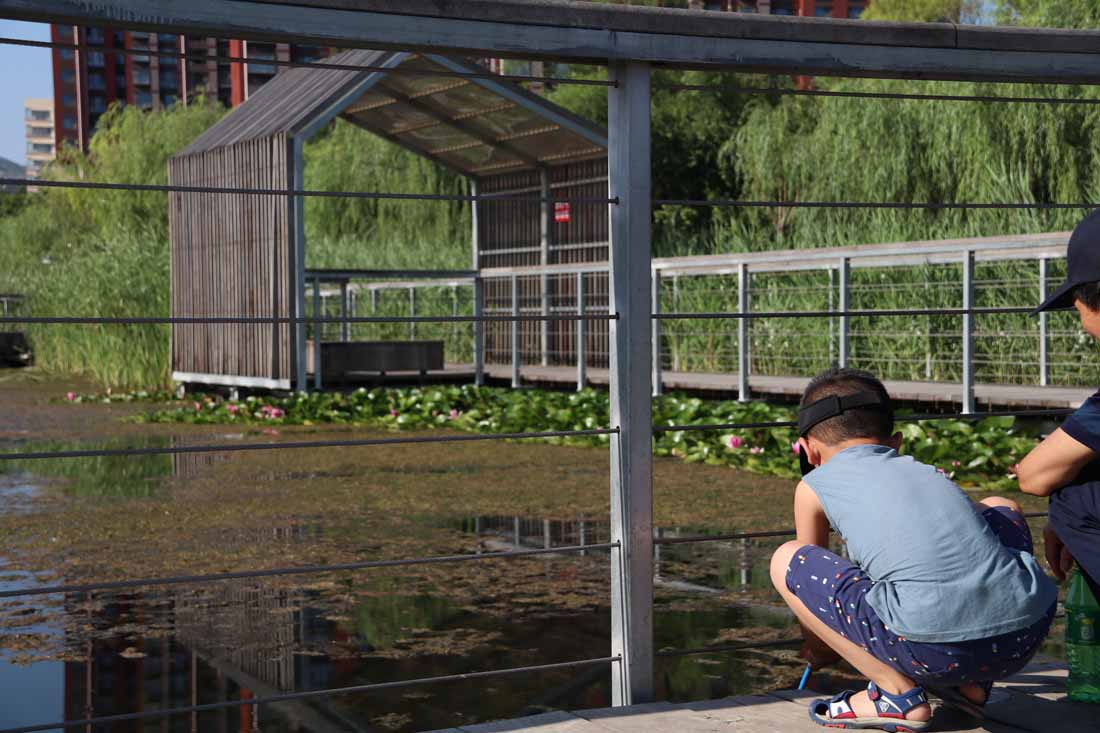 在滨水走廊上行走是一种愉快的体验,行人能够与自然产生亲密的联系。夏日盛开的荷花吸引大量游人,木栈道的设计使他们可以近距离观赏。