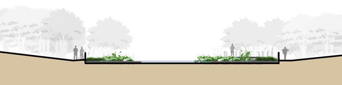 设计是引入。WAQI没有破坏掉原来河道的池壁,而是用种植带将自然引进去,根据河道不同的水位,种植不一样的植物,让河道在各种水生植物与动物、微生物的作用下,逐渐恢复生机与生态多样性。