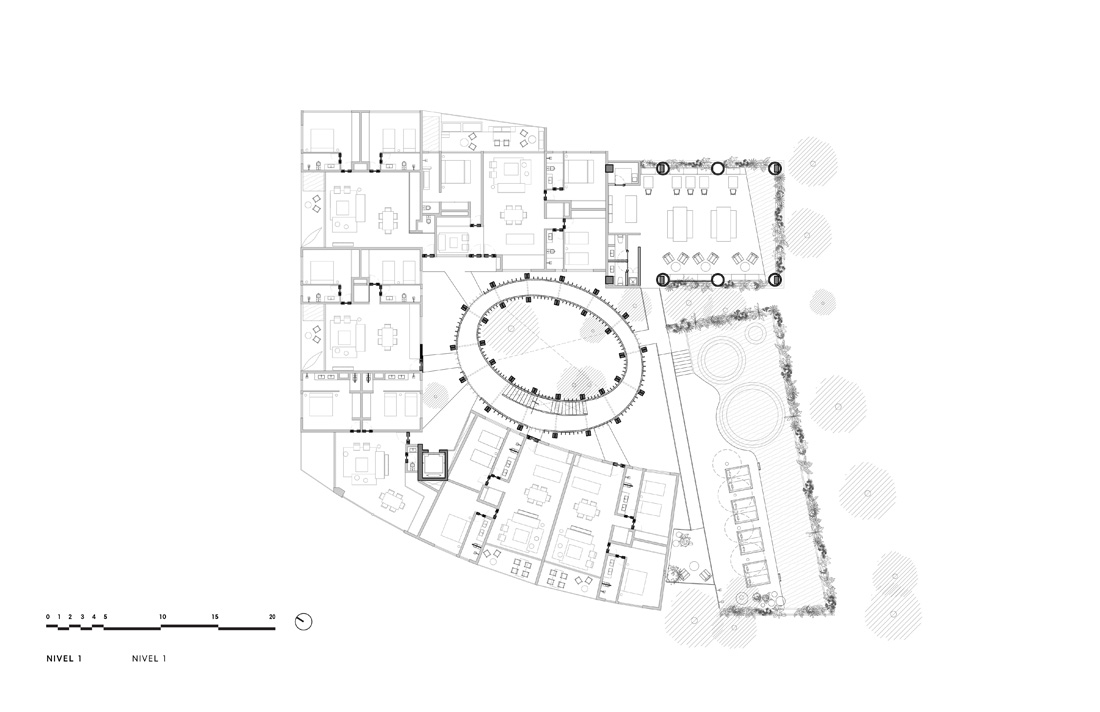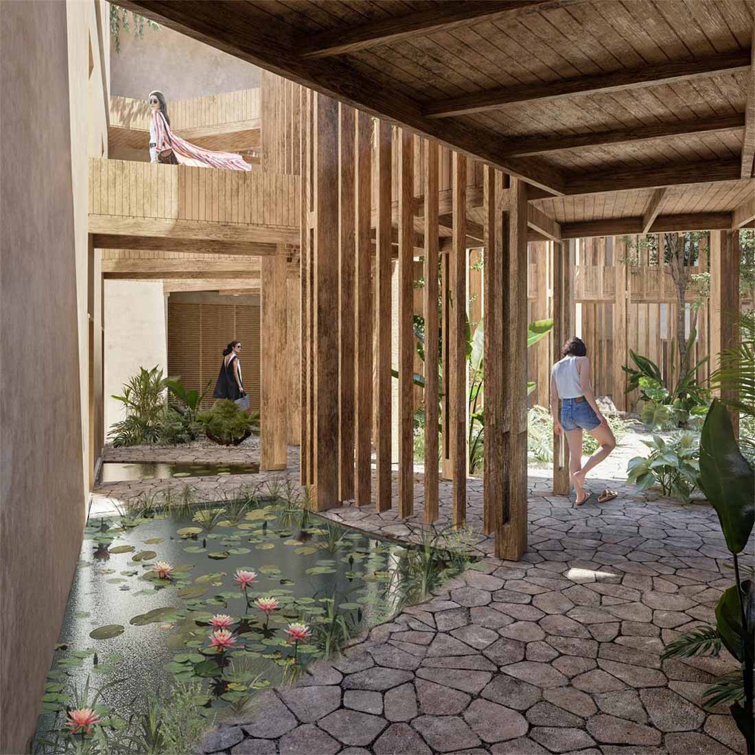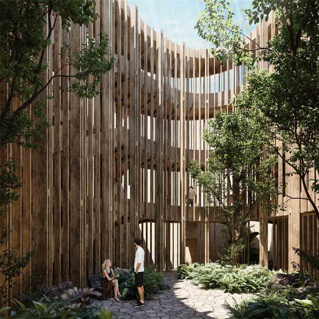 穿过巨大的一体式大厅,一条由椭圆形的木质结构创造的路径出现在眼前,将用户引向被茂盛的植物环绕的内部庭院中心。从这个庭院开始,木制楼梯环绕着椭圆形的建筑群,连接着房屋和公共区域,将每个居民引向他们各自的公寓,直到屋顶。这里的游泳池,可以看到壮丽的丛林景观,地面层还有一片睡莲绿洲,让周围的环境和公寓都变得焕然一新。