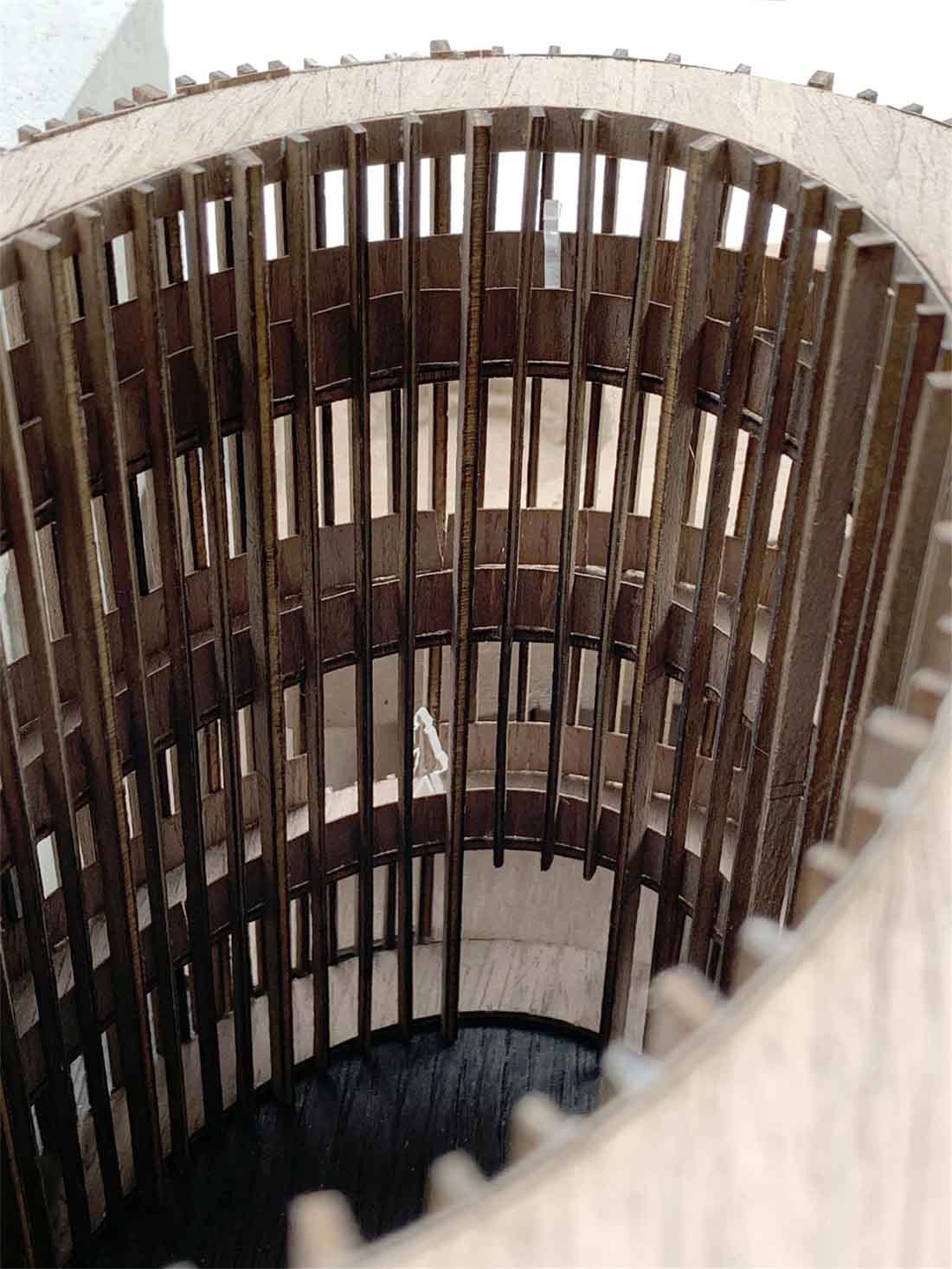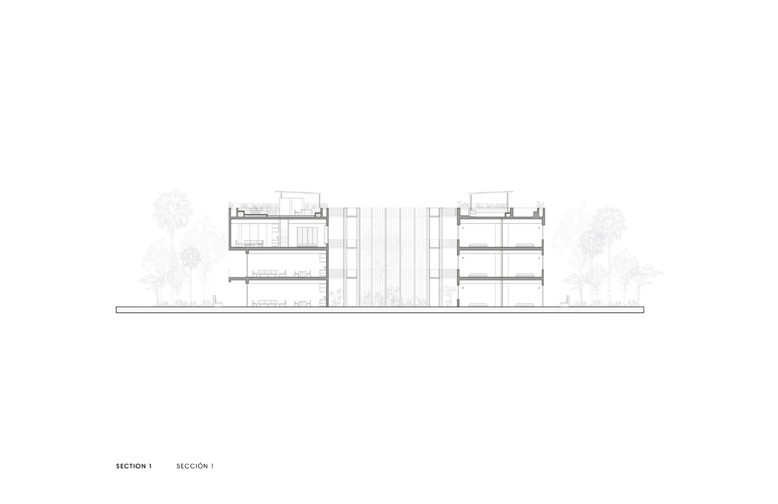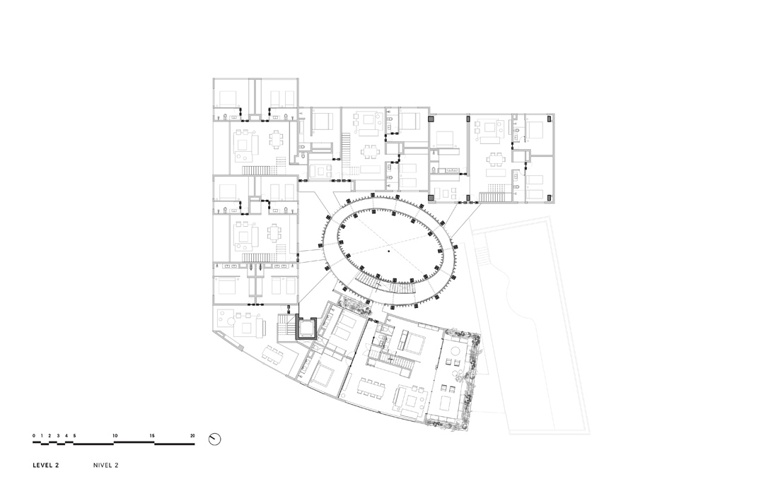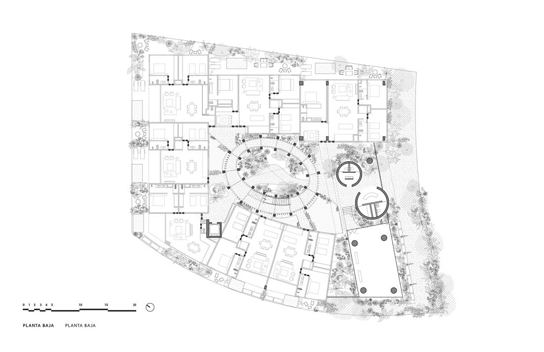 穿过巨大的一体式大厅,一条由椭圆形的木质结构创造的路径出现在眼前,将用户引向被茂盛的植物环绕的内部庭院中心。从这个庭院开始,木制楼梯环绕着椭圆形的建筑群,连接着房屋和公共区域,将每个居民引向他们各自的公寓,直到屋顶。这里的游泳池,可以看到壮丽的丛林景观,地面层还有一片睡莲绿洲,让周围的环境和公寓都变得焕然一新。