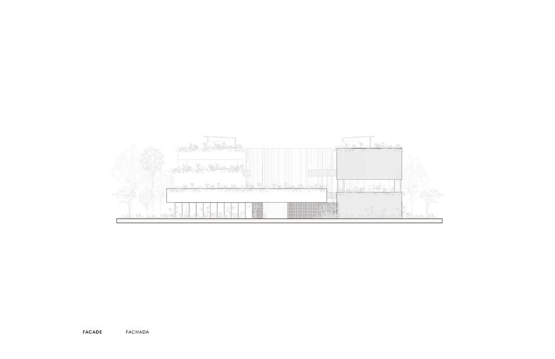 屋顶配置的平台,创造了面向丛林的不同平台空间。悬浮的植被融入建筑群的周围,融合并延续了其自然环境。
