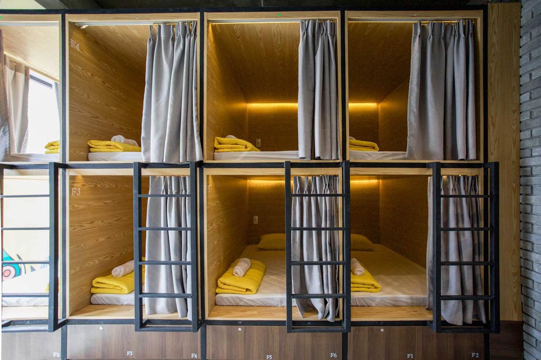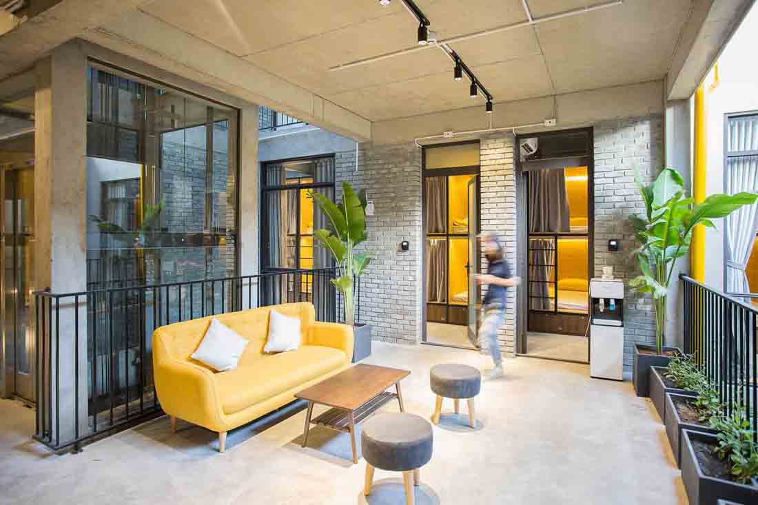 在二、三层:这两层是居住楼层的开端,容纳了多人间的宿舍。在房间之中是一个有着绿色树木的天井,住客可以走到这些区域工作、休闲、交谈以及舒适地吸烟,同时避免对房间里其他人的干扰。