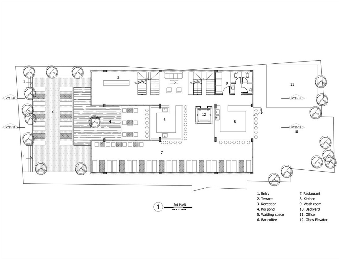 在一层:将整座建筑推到后面,以保留出泊车与花园的空间,并隔离汉江市场与街道嘈杂的噪音。此外这片区域还可以用来享用咖啡以及观看街景。在室内的一边是用于接待的前台,其余部分则用作餐厅和咖啡厅,接待旅舍的住客和外来的常客。建筑的后部是办公室和花园。玻璃电梯营造了宽敞而清新的感受。
