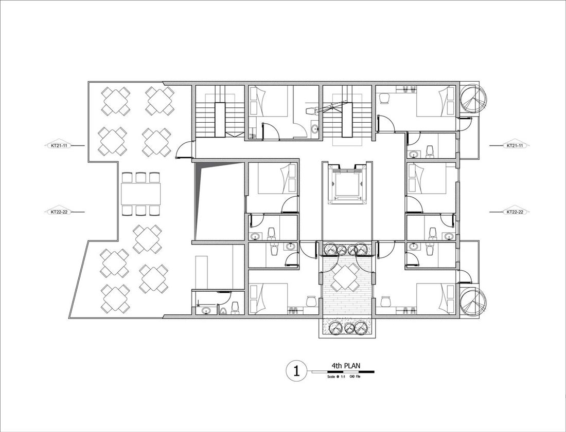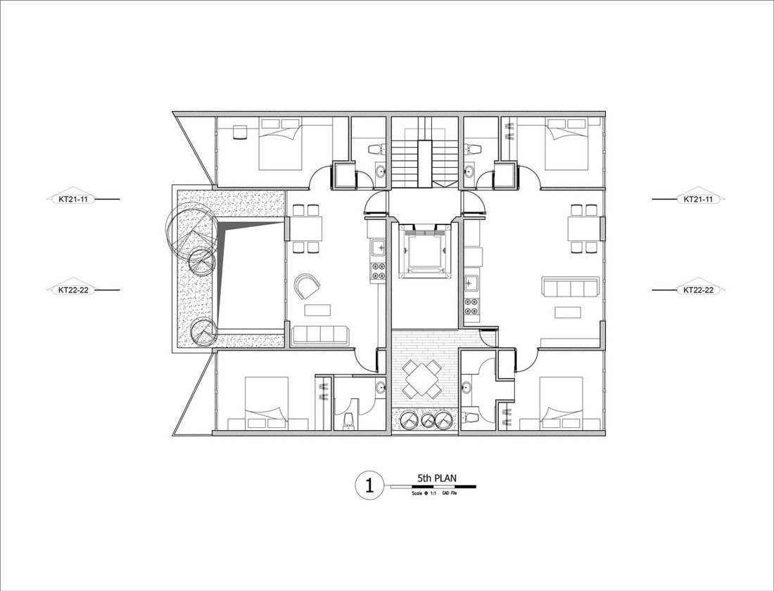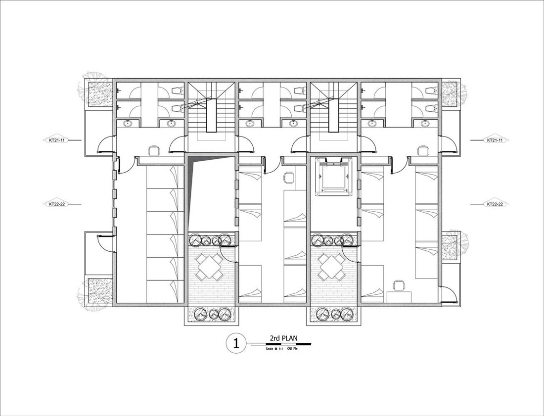 在五层:设计了两套公寓。有两个原因:首先,这块用于建设的土地是租来的,所以房主需要一个能够保证收入的方案;在上面建公寓的话,可以轻松地收到比旅舍更高的租金。第二,由于这一地区对度假公寓的需求巨大,但周边地区并不能满足这一需求,因此公寓的出租率能得到保证。
