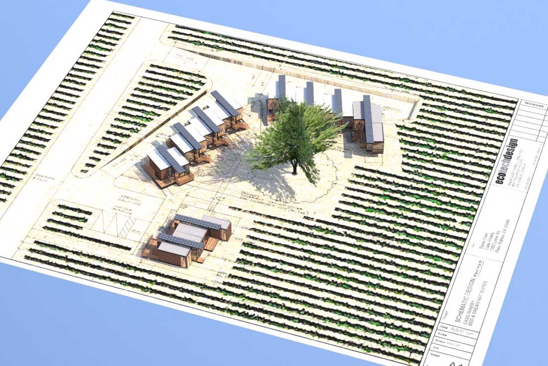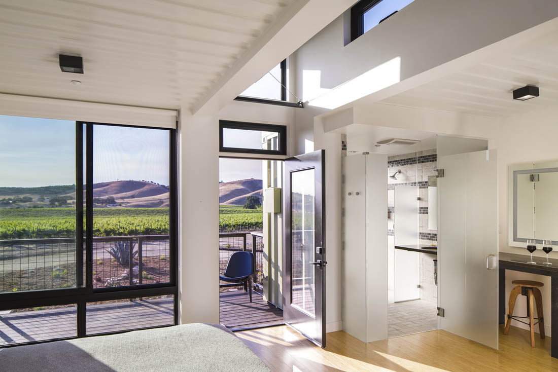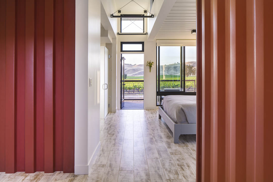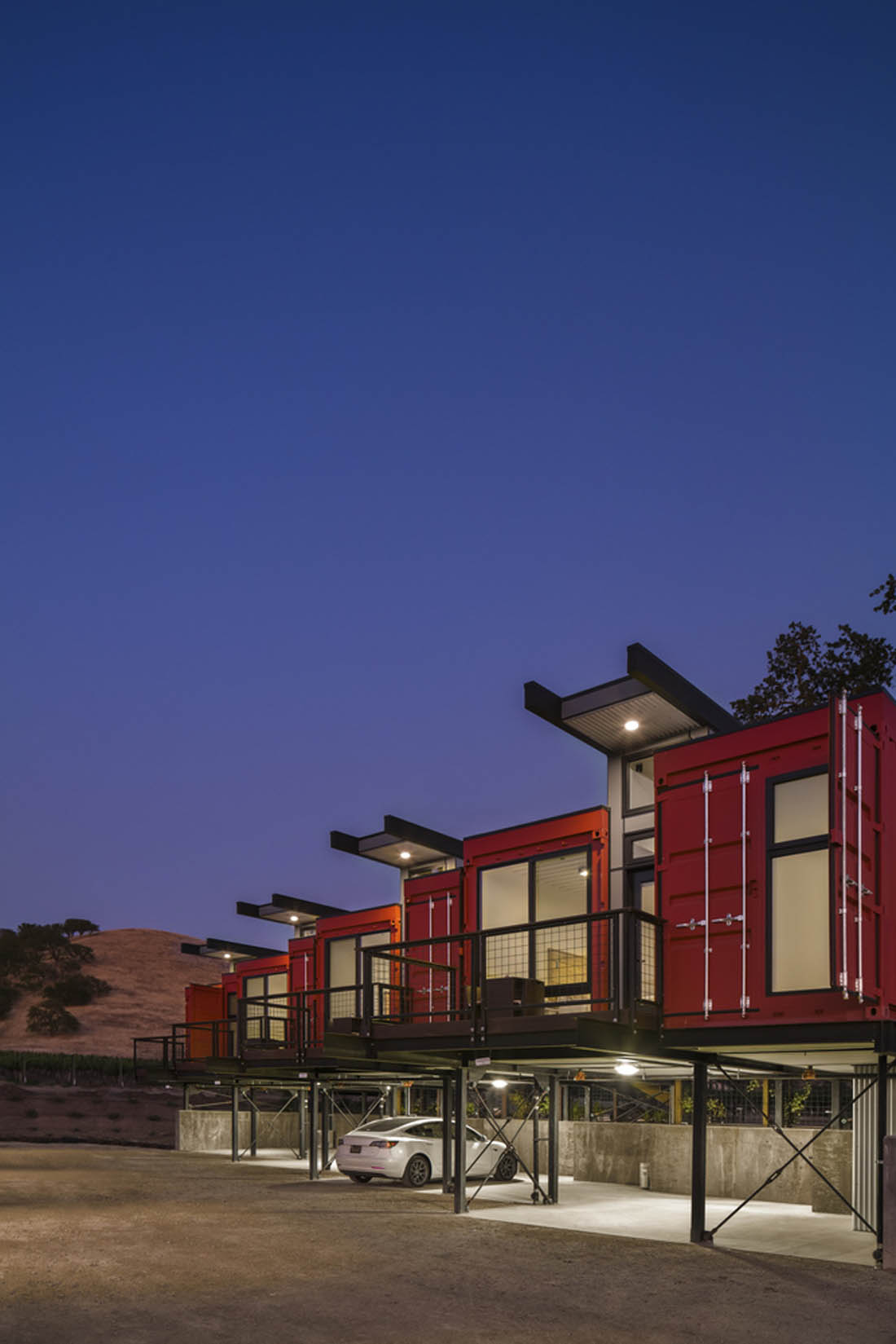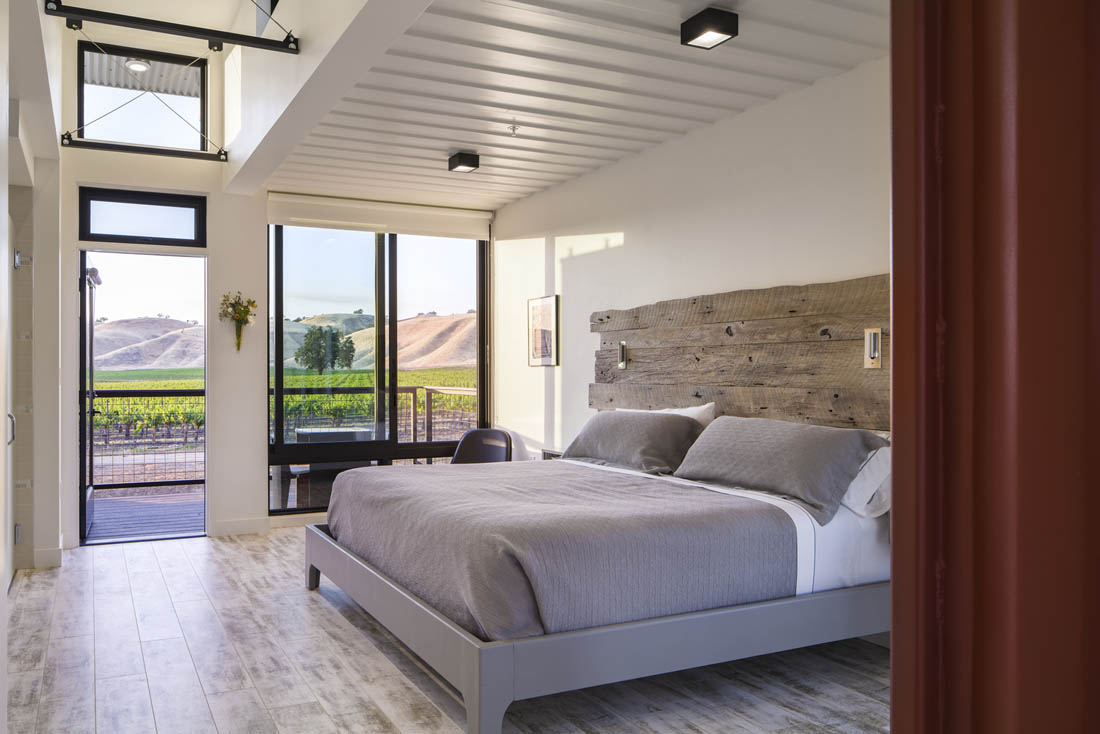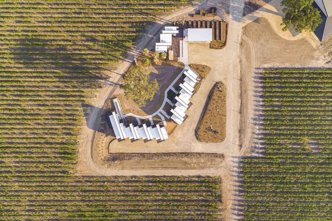 在145英亩充满活力的葡萄树和起伏的丘陵之间设置了豪华的住宿旅馆。每个建筑都采用可回收的和本地采购的可持续材料和饰面,并坐落在遮盖着的停车场和周围的葡萄园上方。