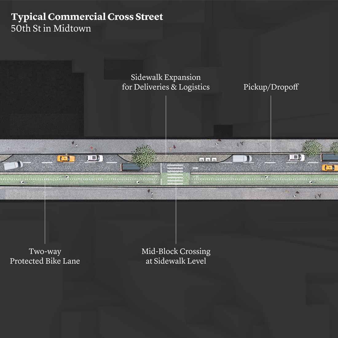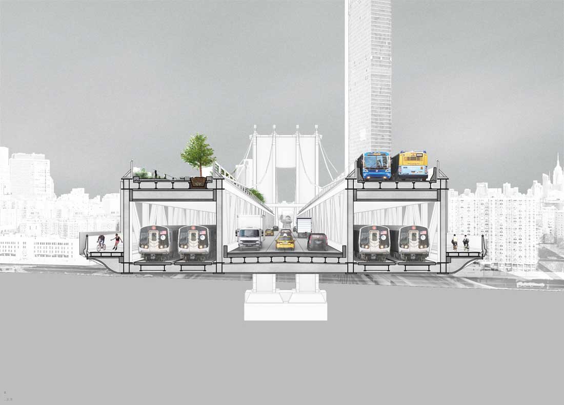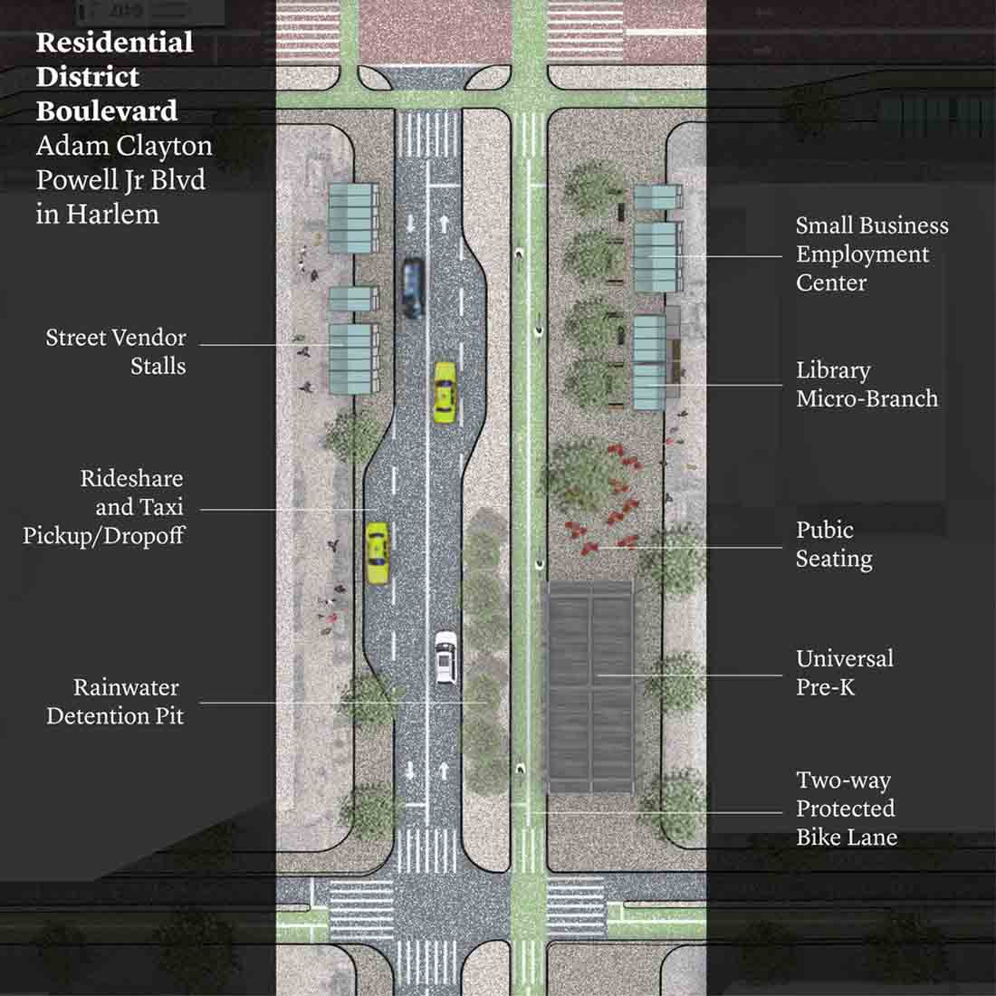 取消停车将为大型垃圾桶和更多的自行车道创造空间。额外的人行横道将使人们更容易安全地过马路。对于桥梁进入曼哈顿,尤其是曼哈顿桥坊七巷的汽车,新的布局将取代公交专用道,骑自行车者的路径和行人长廊四个车车道。三条车道将用于出租车和共享车辆。中间的车道会根据需求切换方向。一条扩大的绿道将与该岛西侧的一条绿道相连,使人们更容易在曼哈顿周边骑自行车,跑步和散步。