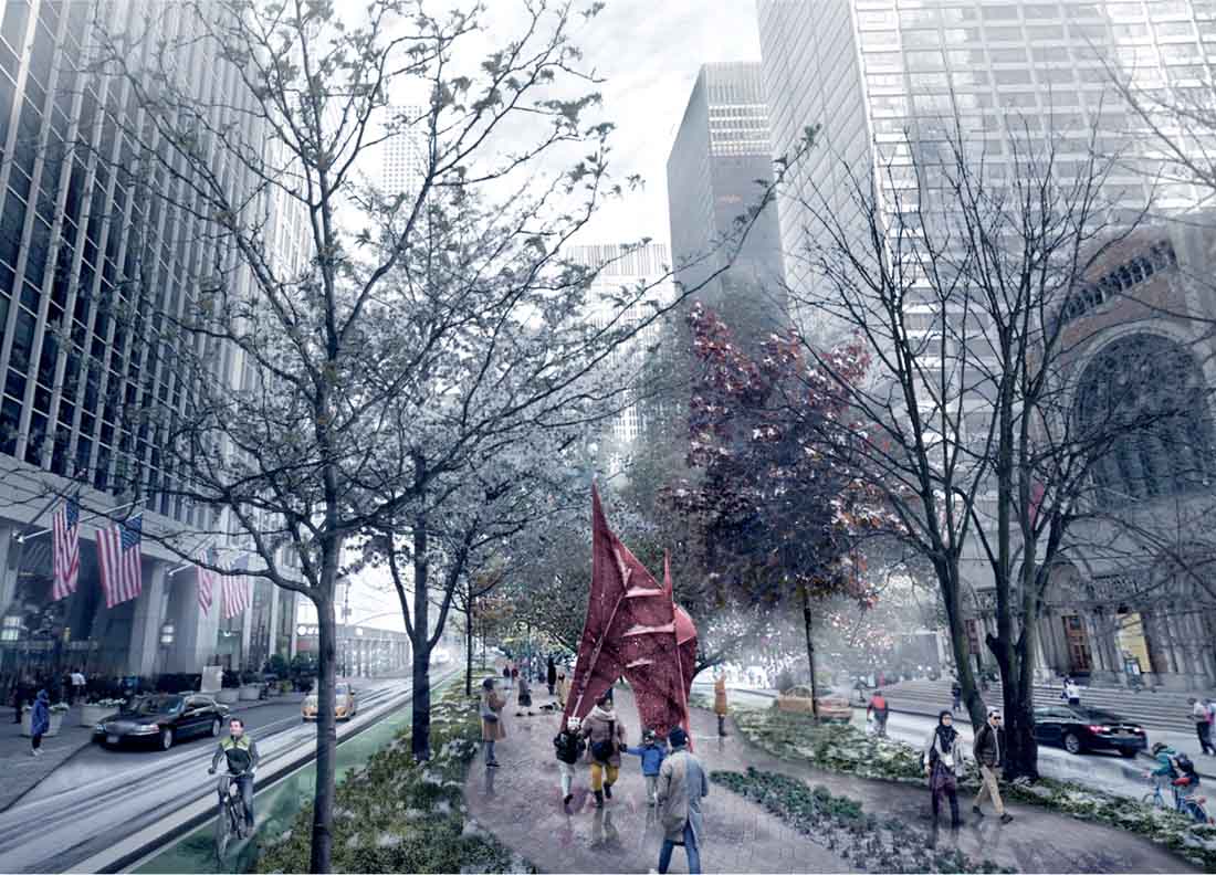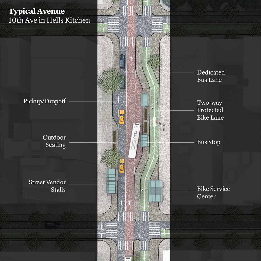 在无车世界中,城市可以扩展人行道,为行人提供更多空间。双向自行车道可以在两个方向上代替汽车道。混凝土屏障将保护骑自行车的人。专用的公交专用道,无汽车通行,可以有效地将人们穿梭于曼哈顿和出入曼哈顿,并缓解地铁系统的拥堵。