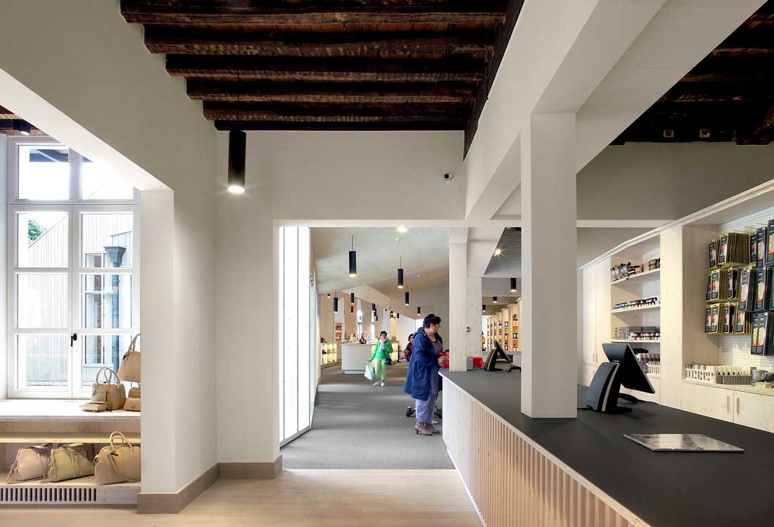 设计师保存并修复了吉尔(Geel)的旧院舍,从而保留了房间的结构。在后面,新建筑物与具有历史价值的建筑物相连。宽敞且半开放的内部花园使迪安妮尔和新建筑之间形成了距离,新建筑共同容纳了一家大型鞋店。从第一个内部花园中,客人可以通过内部区域的新“大厅形”空间看公园的某些视角。