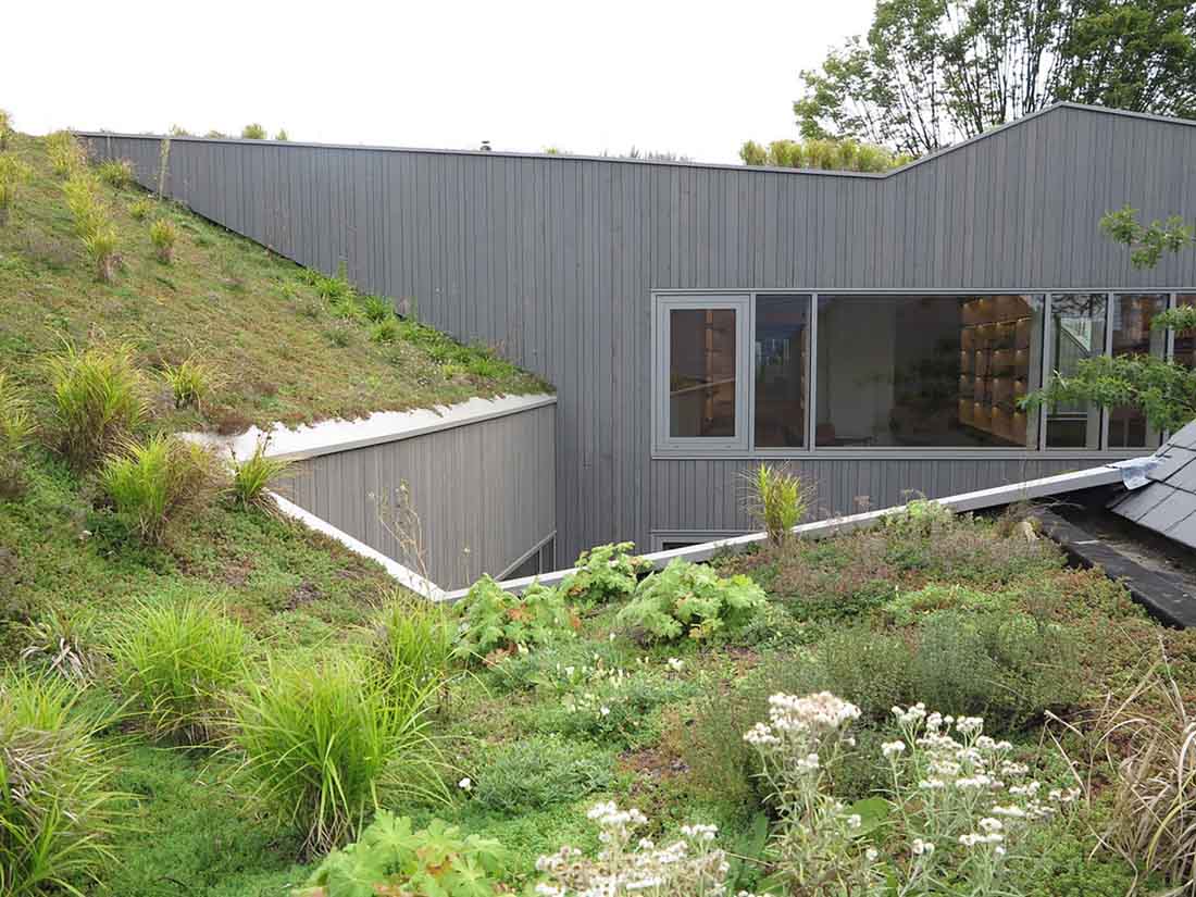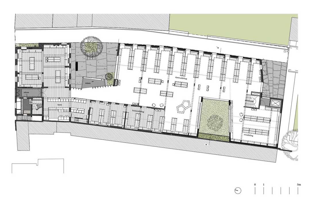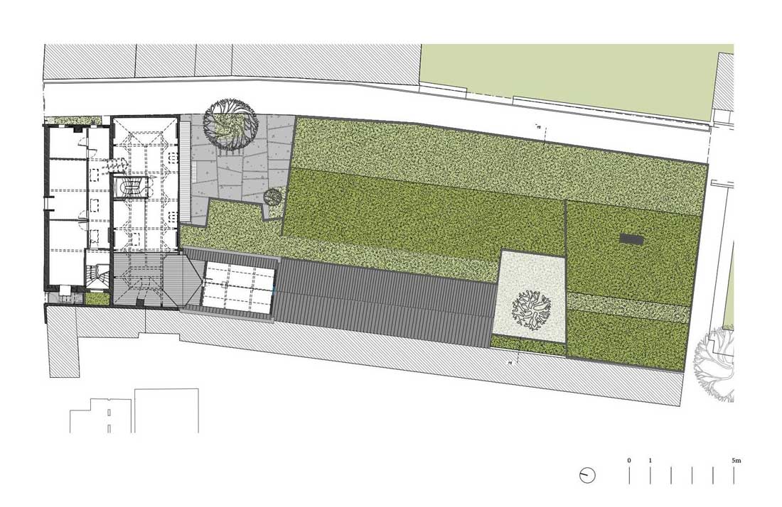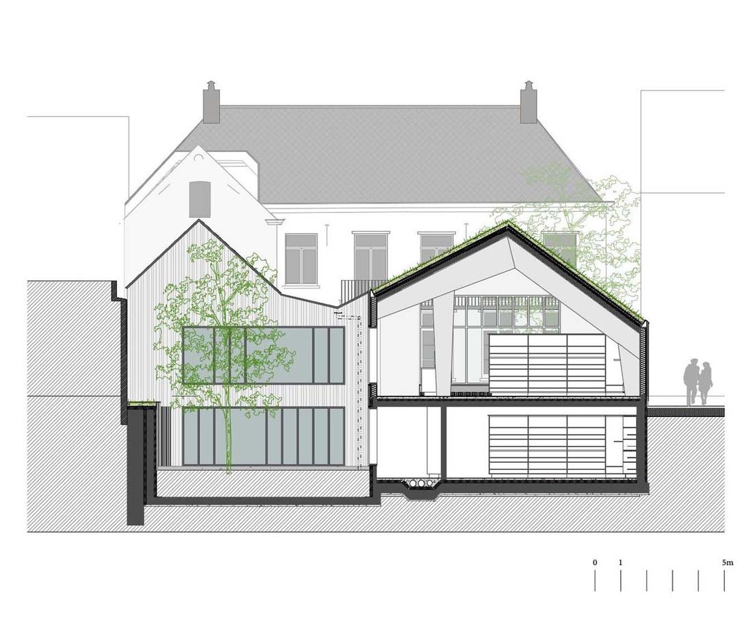 通往大厅山脊的开放性进一步增强了这一点。各种内部花园的切口将新建筑分解为更小的组件。天井使建筑物绿色开放,从而创造了绿色开放的内部区域。新建筑物的屋顶结构继续在分支机构及其附属建筑物的倾斜屋顶上串联。一方面,这种轮廓确保了建筑物与历史遗产。另一方面,屋顶表面的阴影确保了小城镇织物在规模上的整合。新建筑的屋顶是绿色的屋顶,上面长满草和花。