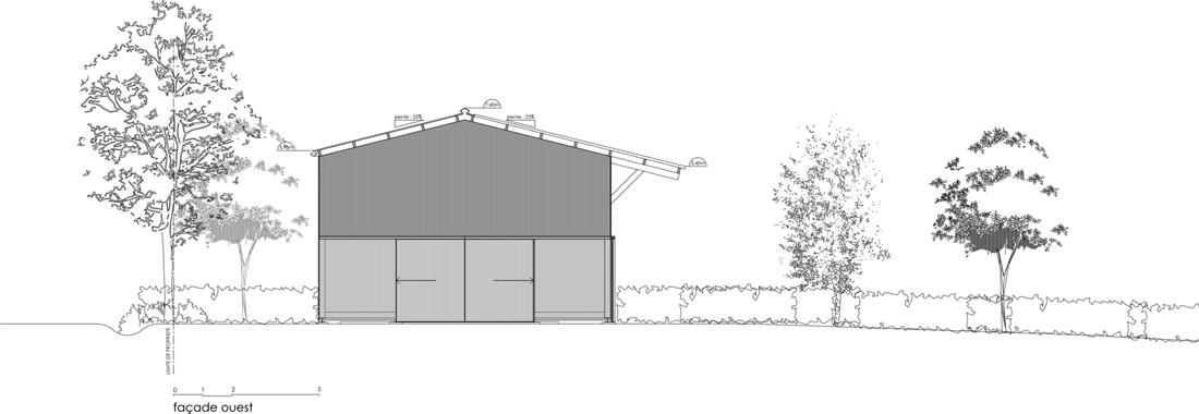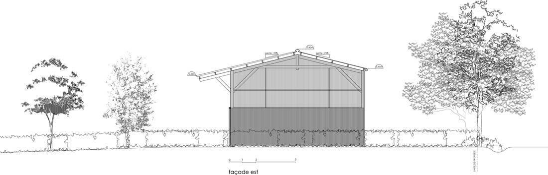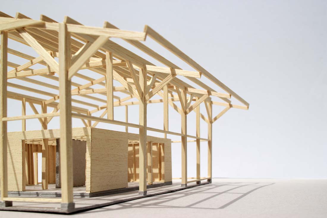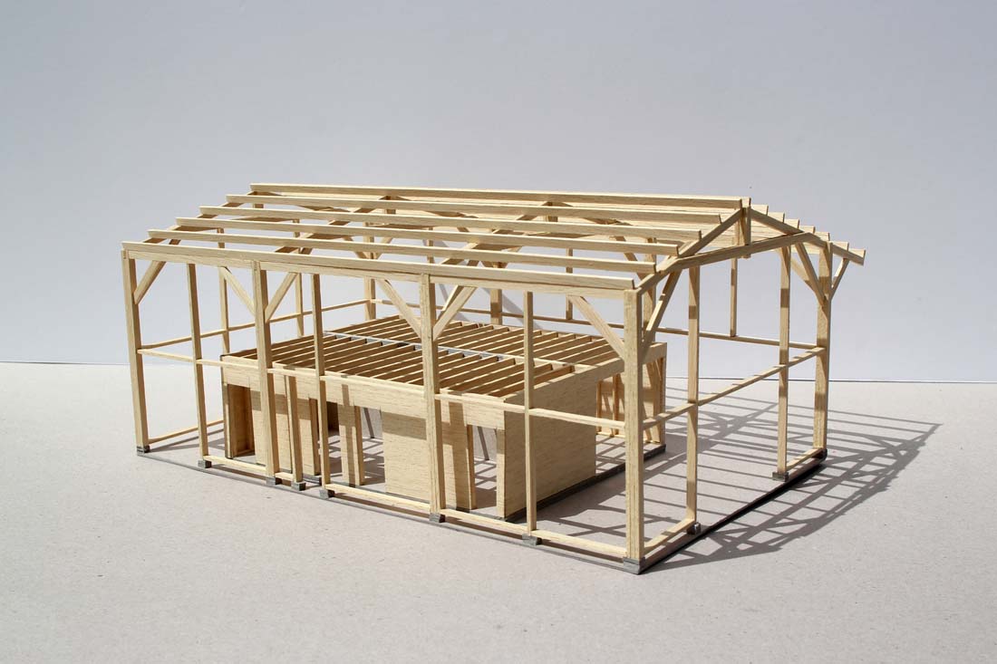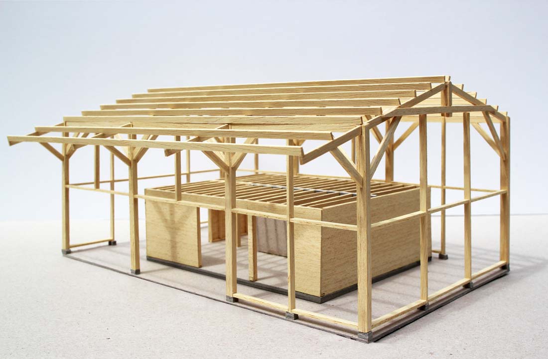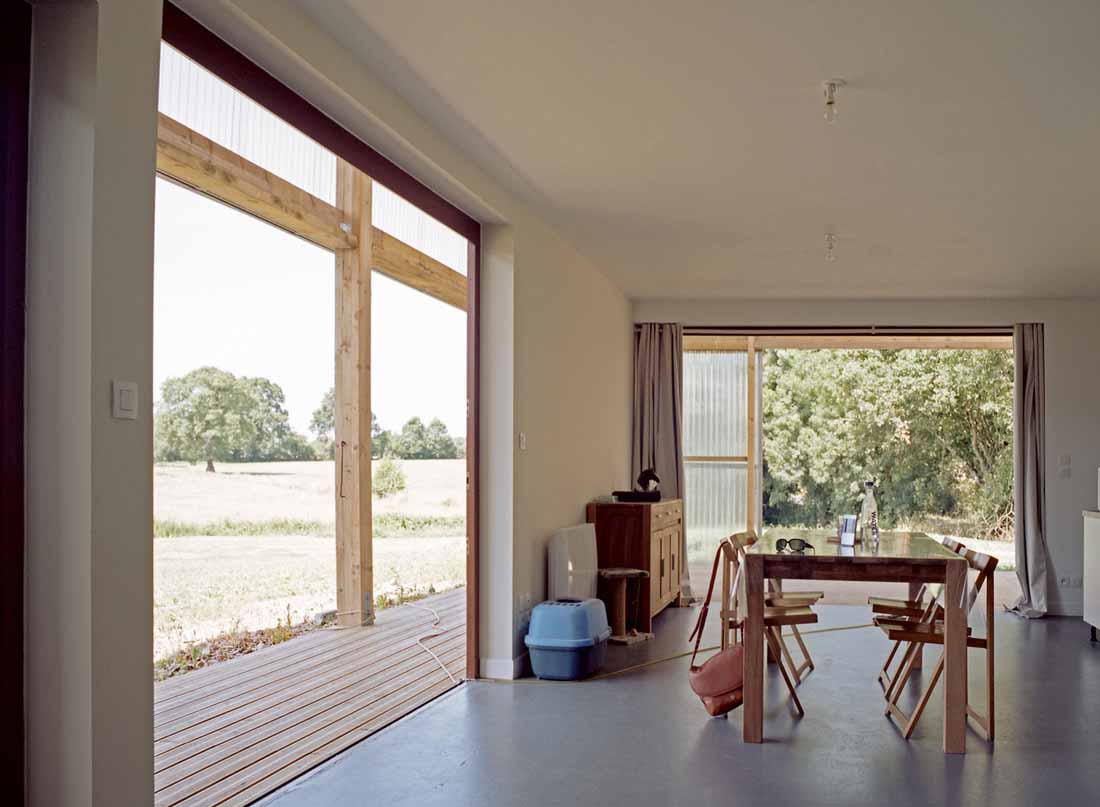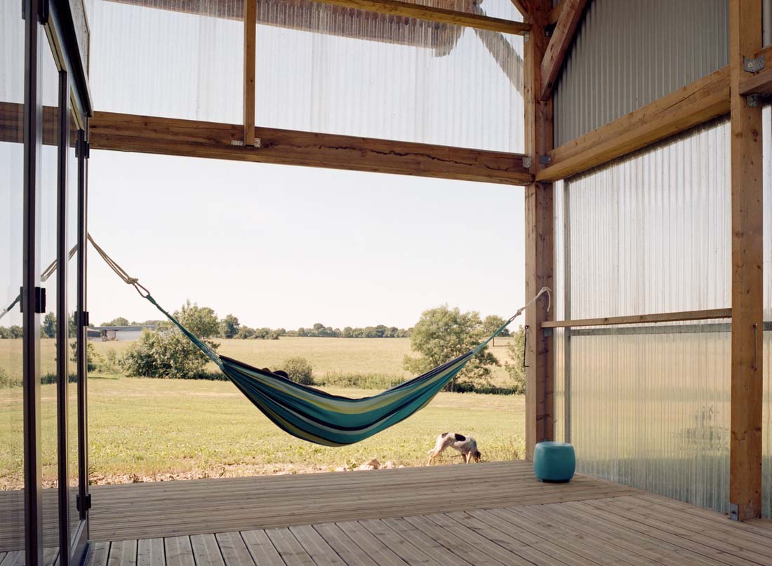 设计灵感源于‘配套’这个想法,在确保良好使用成效的同时,也缩短了现场工作时间。整套建筑元件被分成两个部分,第一个部分由三个传统木构架构成,形成一个大的覆盖体,可容纳房子两层。外壳覆盖着白色波纹金属板和聚碳酸酯,可以起到遮荫的作用,以及对光线、农场的视野、住户间的隐私性都起到了一定的作用。它可以在不改变建筑外部构造的情况下,满足家庭扩建的需求。