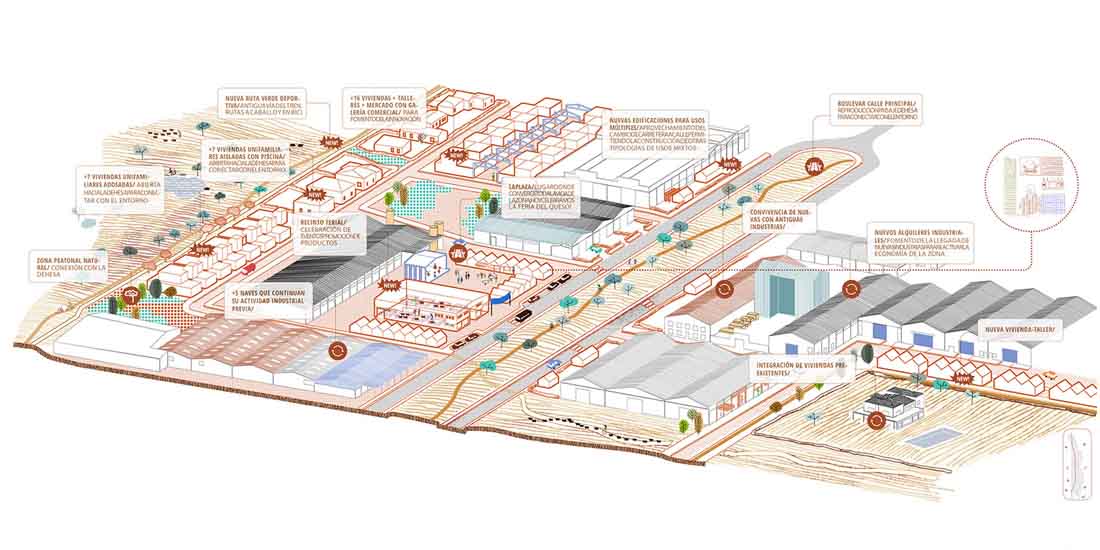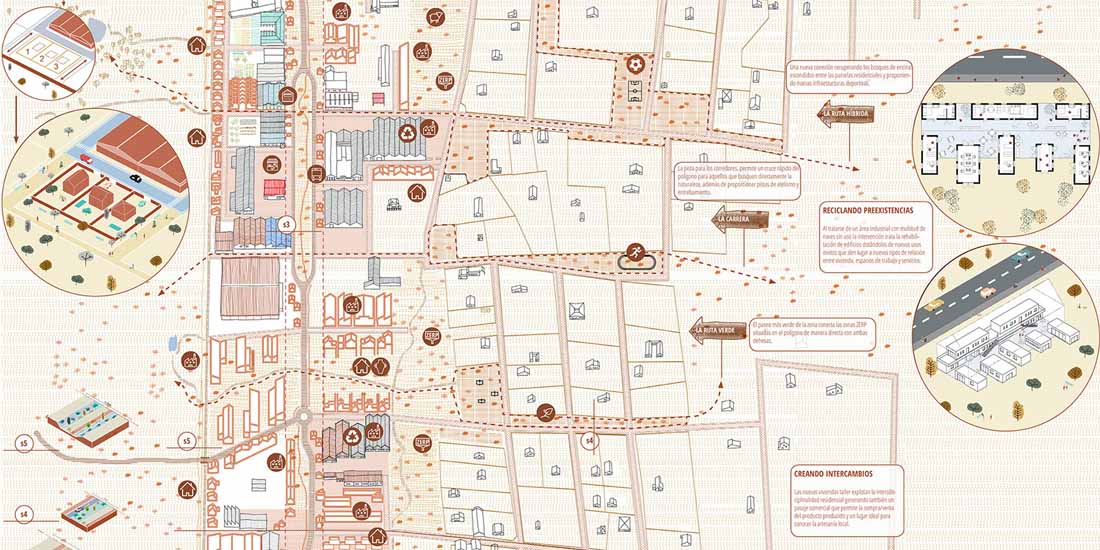 规划方案为工业区赋予了包括住宅在内的多种用途,原先的国道将被改建为城镇规模的马路。线性的基础设施及其场地被重新规划为公共领域(在平面图中现实为红色的地块)其目的是促进公共空间和开放空间的发展,从而将该区域与整个城市和自然景观连接起来。项目还与当地的企业进行了交流和讨论,以便对当地的土地、产业发展以及就业机会进行评估。