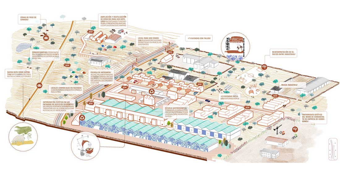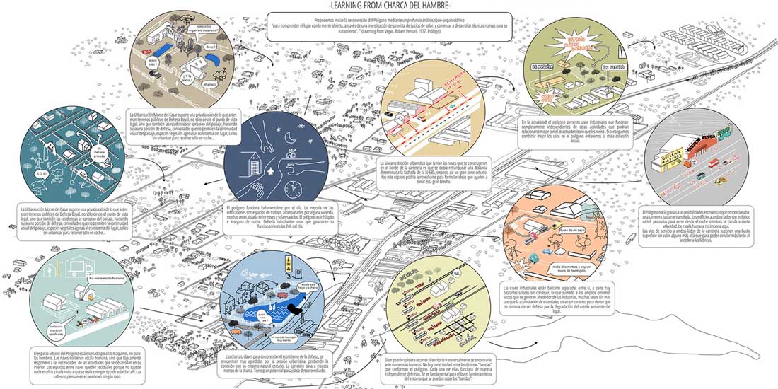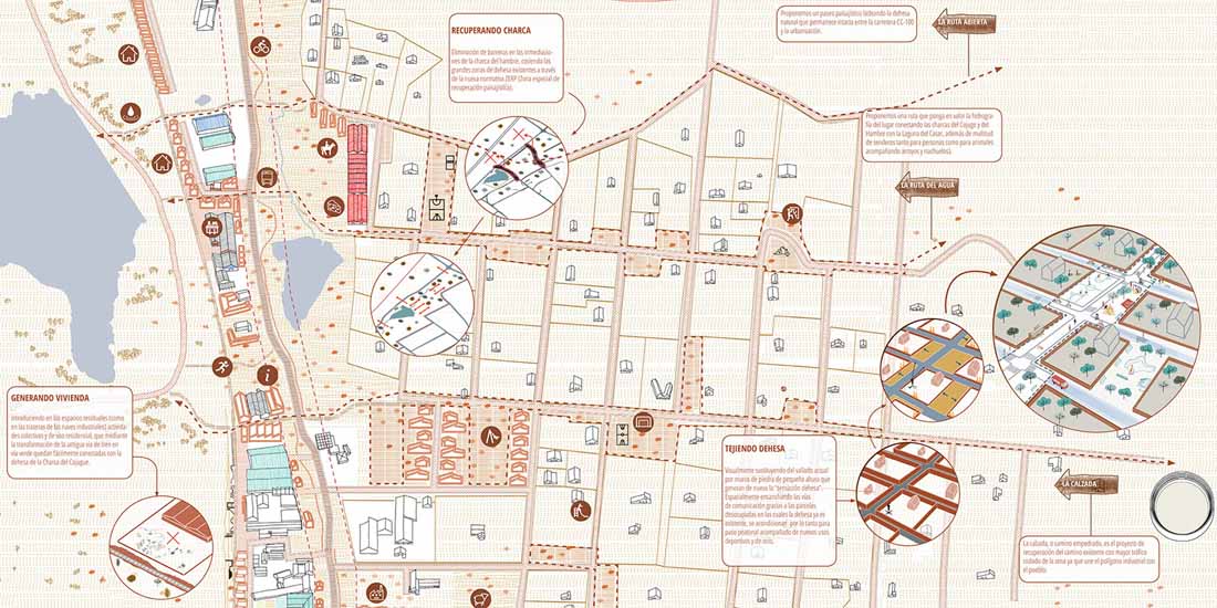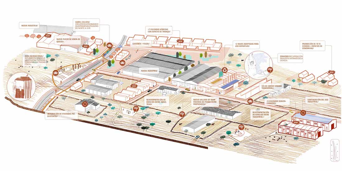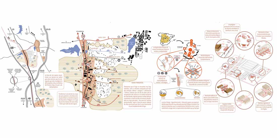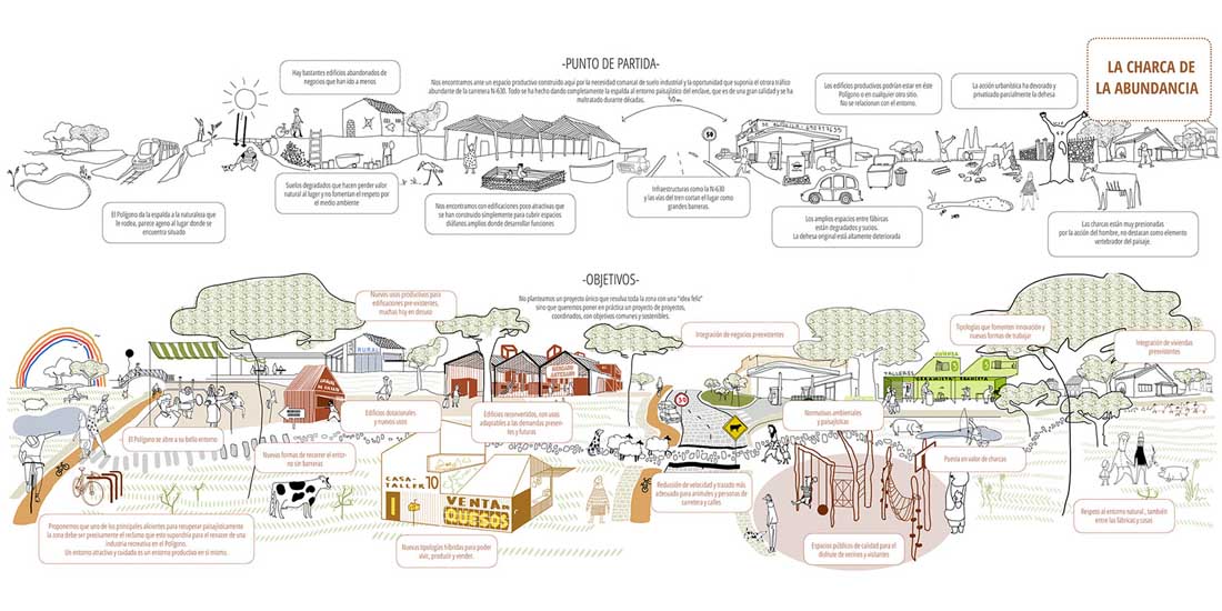 该项目由埃斯特雷马杜拉地方政府与卡塞雷斯市议会共同提出和推进。卡塞雷斯市约有4500位居民,项目的场地距离城市8公里,仅有约10分钟的车程。项目场地位于城市外缘的Charca del Hambre工业区,贯穿该区域的N‐630公路和铁路线为其赋予了明显的线性特征。在A66号高速公路开通之前,工业区一直发挥着重要的作用。场地周围的区域也拥有十分重要的环境价值,天然的水池和草地环布四周,为工业区的重新构想提供了绝佳的机会。