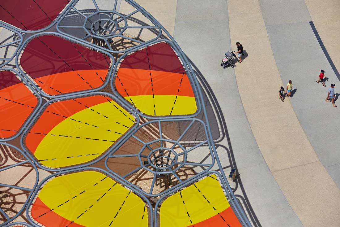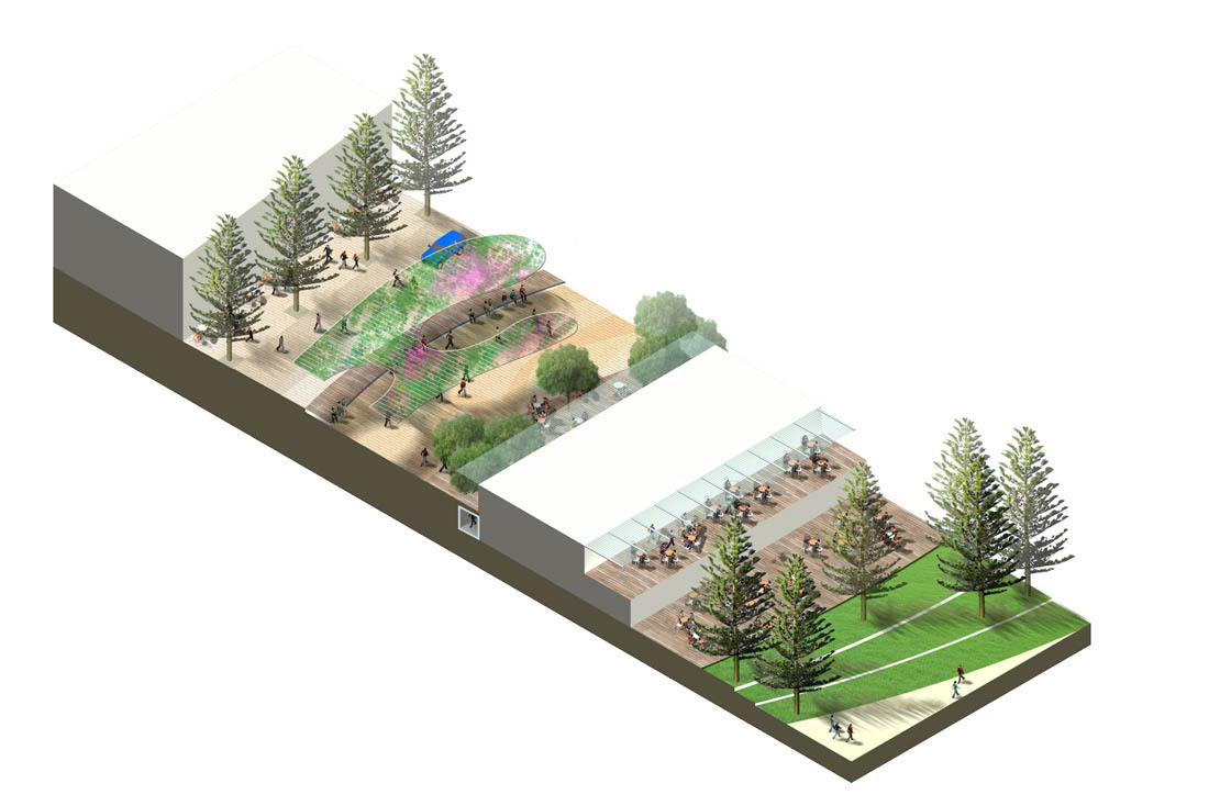 市民空间“斯卡伯勒广场”在海滩和海滨大道之间,它是人们前往前海岸的主要通道,场地上包括一组标志性遮荫凉棚。凉棚的设计灵感来自于自然系统和几何结构中的“泰森多边形”(是一个很有意思的图形模式,既有数学的逻辑,又有自然的变性法则)。